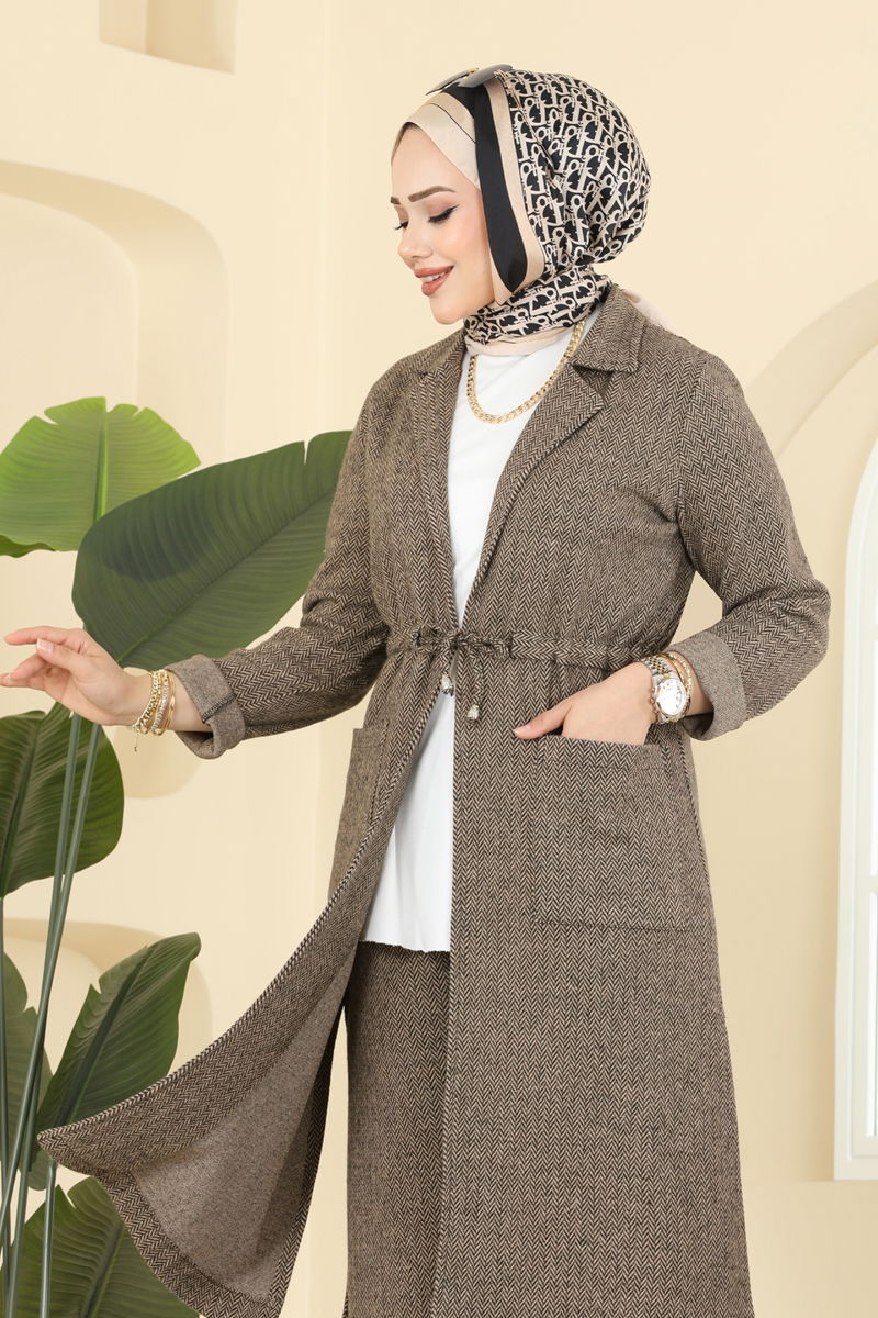 This elegant and modern Belt Tunnels Herringbone Suit COMBINE is a perfect addition to your modest wear collection. Ideal for autumn and winter, this piece offers both comfort and style with its delicate fabric that can be washed at 30 degrees. The herringbone patterned fabric stands out with its double-breasted collar detail and unlined structure, while the tied waist and elastic waistband of the pants provide all-day comfort. Both the jacket and pants feature pockets, adding functionality.