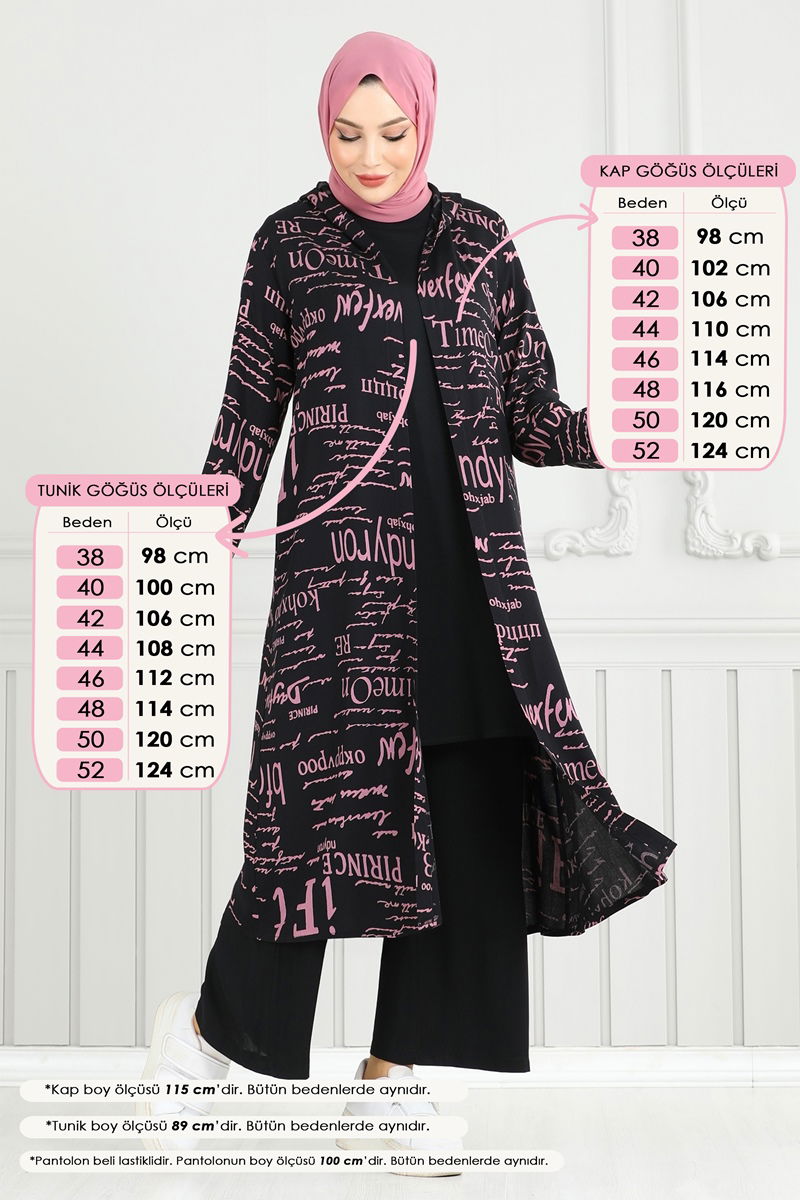 Product Feature : It is a new season hijab fashion product. It has a button that can be used from the back. The product has a Cycling collar. Unlined. The writings are in print. The inner tunic is sleeveless. The hood is sewn to the product. The waist of the trousers is elastic. There may be a tonal difference in the product due to concept photo shoots.