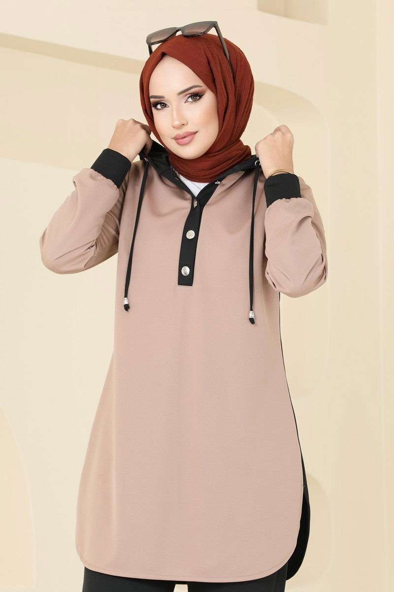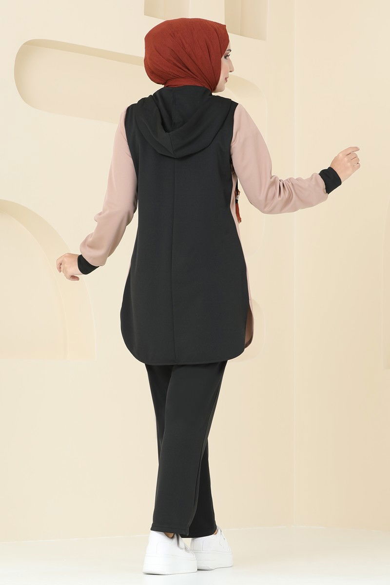 Half-Buttoned Hooded Set model is a hijab product. It can be used in all four seasons. It should be washed at 30 degrees without squeezing. It is Knitted Dabıl fabric. The product has a hooded collar. The product is front usable and half-buttoned. It is unlined. (The product on the model is size 38.) The waist of the pants is elastic.