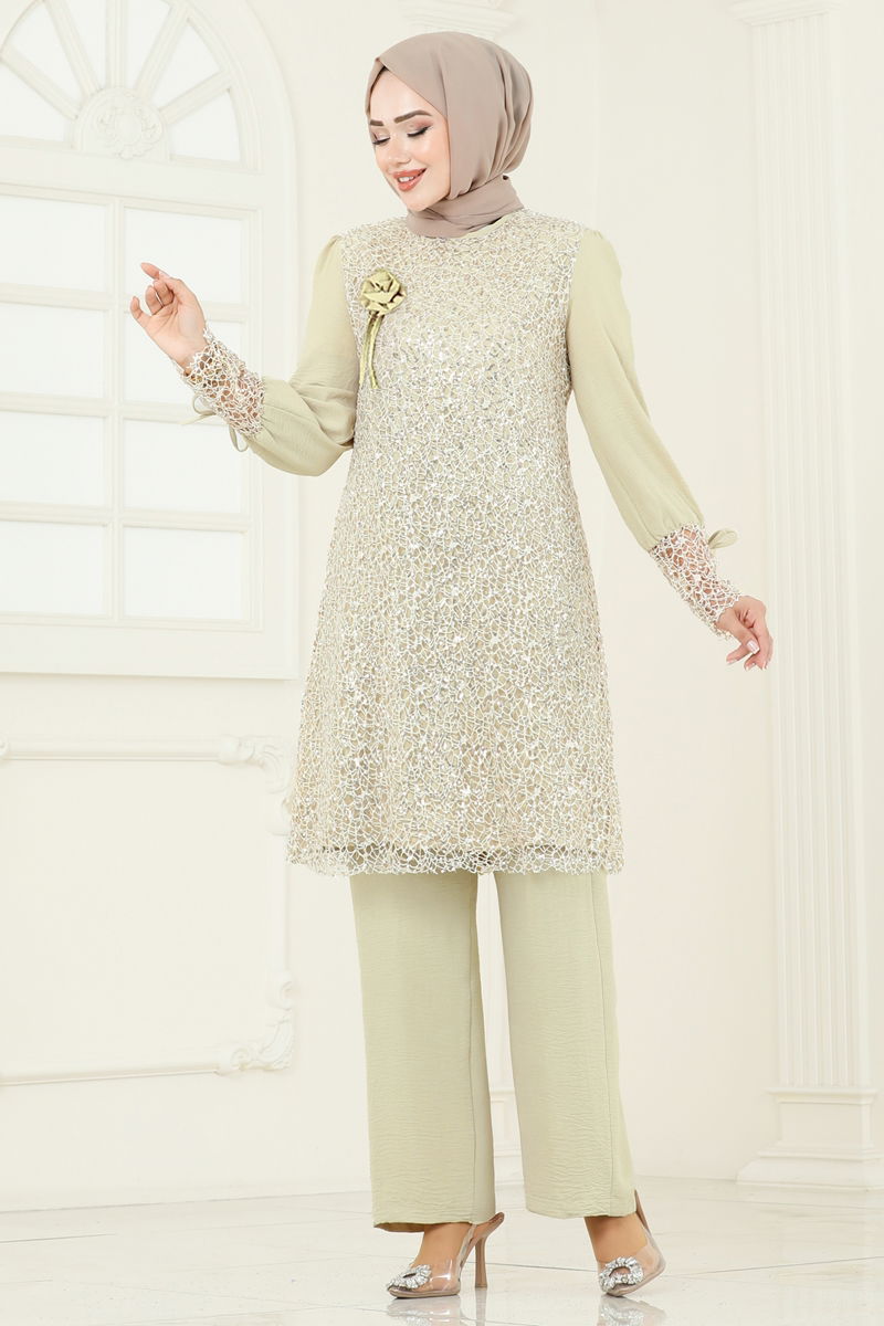 المنتج لديه ياقة دائرية. غير مبطنة. المنتج به سحاب في جزء من الخلف. الاكسسوار يتضمن المنتج يستخدم حسب الرغبة تفاصيل الترتر اللامع تم خياطته خصر البنطال مرن. قد يكون هناك اختلاف في الدرجة اللونية في المنتج بسبب التقاط الصور الفوتوغرافية.