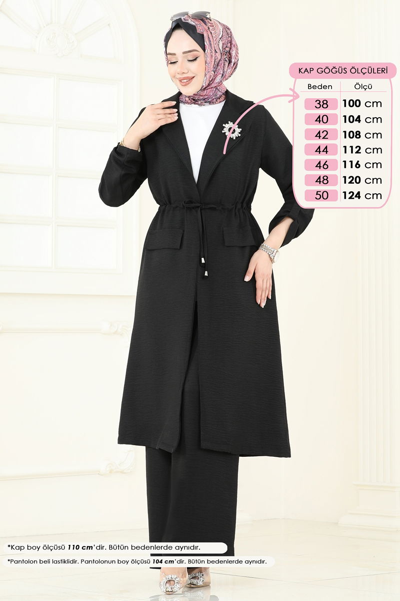Product Feature : It is a new season hijab fashion product. It has a laced waist. The product has a Double-breasted collar. Unlined. Accessories are not included. Blouse is not included. Sample combination is made with the blouse to show the intended use of the product. Pocket details are accessories. The waist of the trousers is elastic. Cuff buttons are active. There may be a tonal difference in the product due to concept photo shoots.
