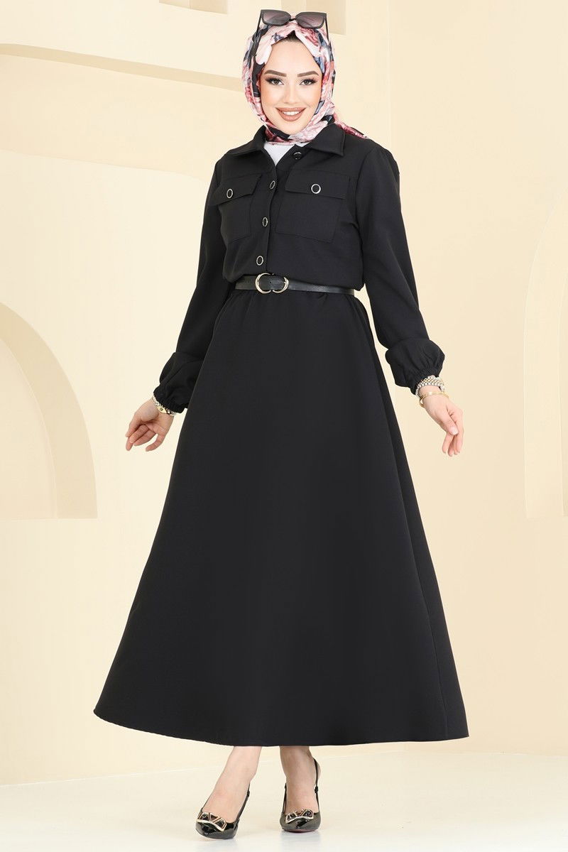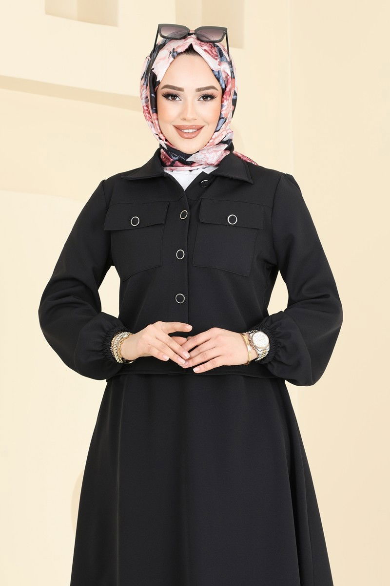 Product Feature : It is a new season hijab fashion product. The product has a Shirt collar. The product has From the front buttons. Unlined. Belt is not included. Shirt is not included. Sample combination is made with the shirt to show the intended use of the product. The chest pocket is active. The skirt waist is elastic. The cuff is rubberized. There may be a tonal difference in the product due to concept photo shoots.