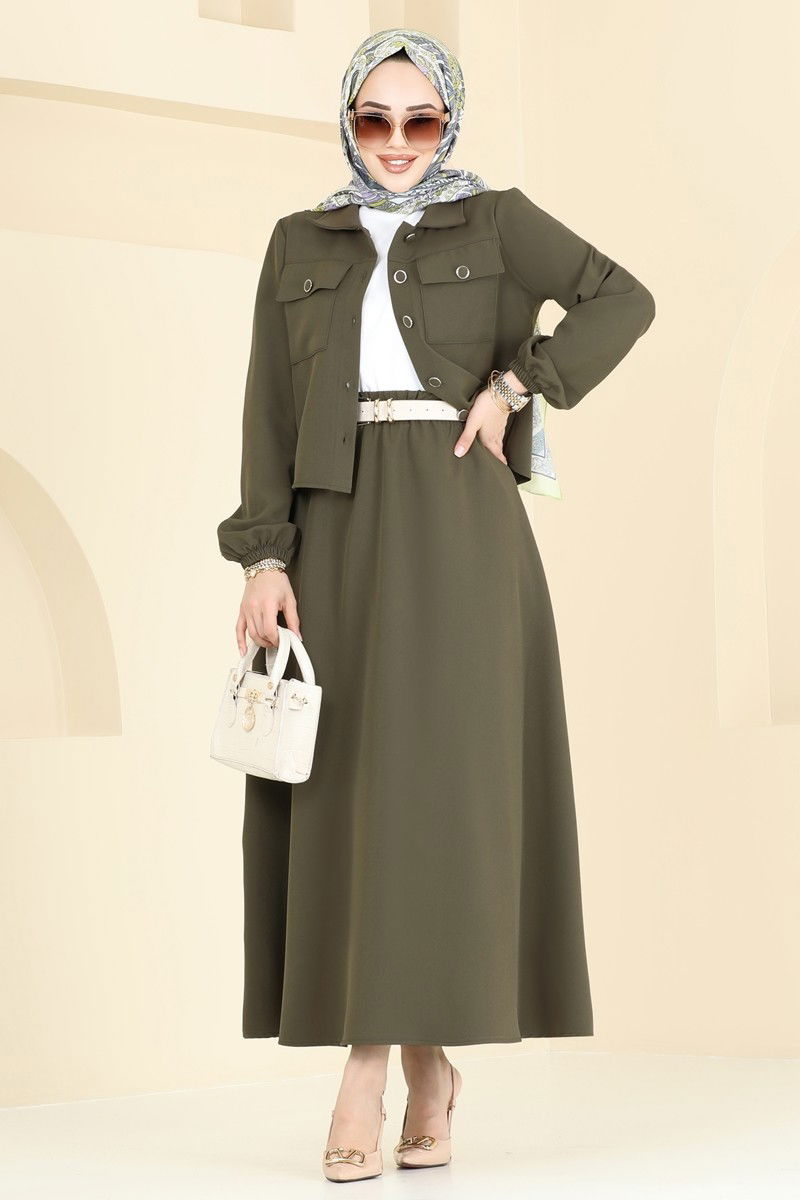 Product Feature : It is a new season hijab fashion product. The product has a Shirt collar. The product has From the front buttons. Unlined. Belt is not included. Shirt is not included. Sample combination is made with the shirt to show the intended use of the product. The chest pocket is active. The skirt waist is elastic. The cuff is rubberized. There may be a tonal difference in the product due to concept photo shoots.