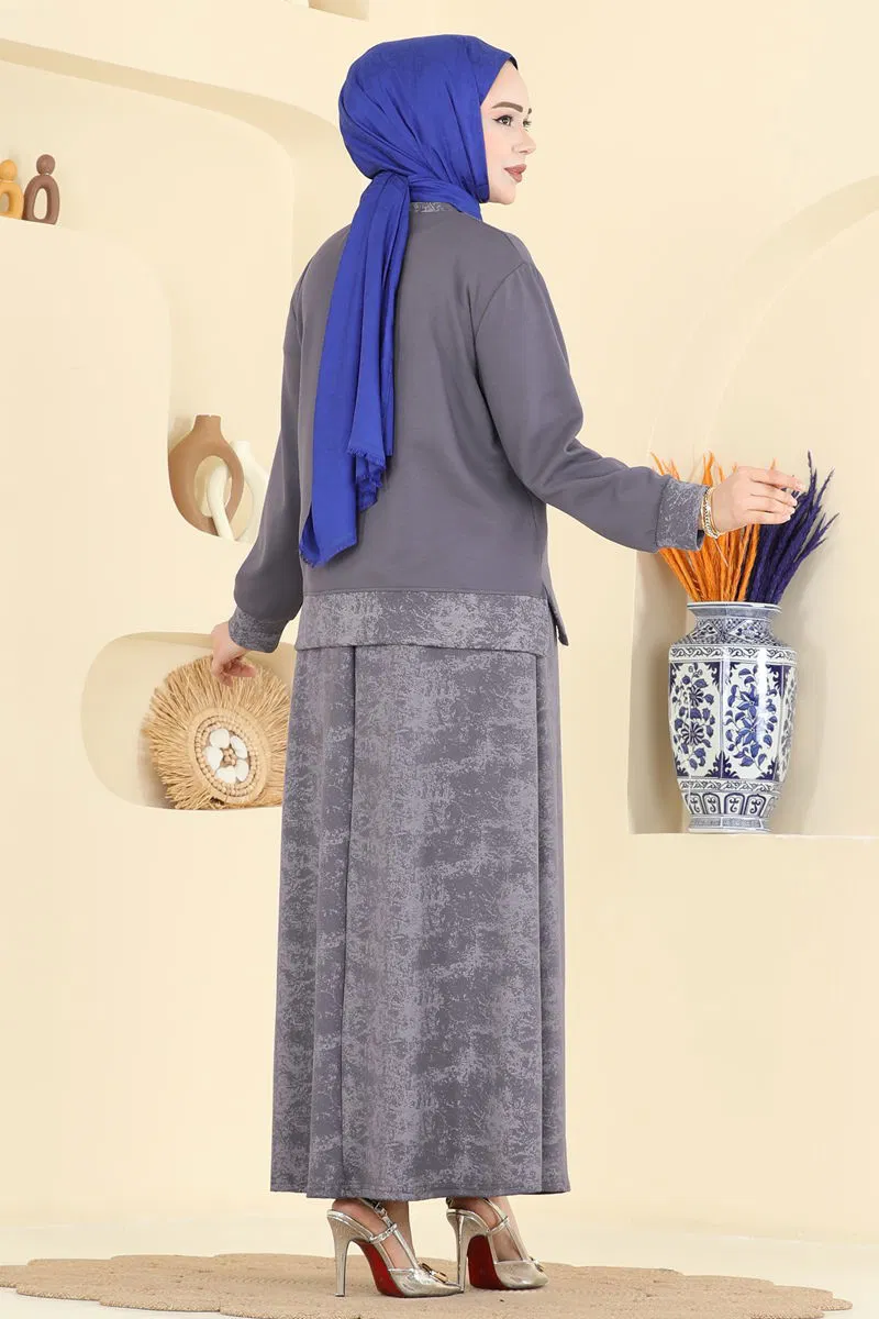 'The Printed Detail Modal Set model is a hijab-friendly attire that can be comfortably worn in all seasons. Made from carefully selected modal fabric, this set offers both comfort and elegance. Its crew-neck tunic and side slit details provide a contemporary look. The skirt's elastic waistband ensures a comfortable fit, while the added patch details bring a stylish touch. Suitable for cold wash at 30 degrees, this product promises durable use.'