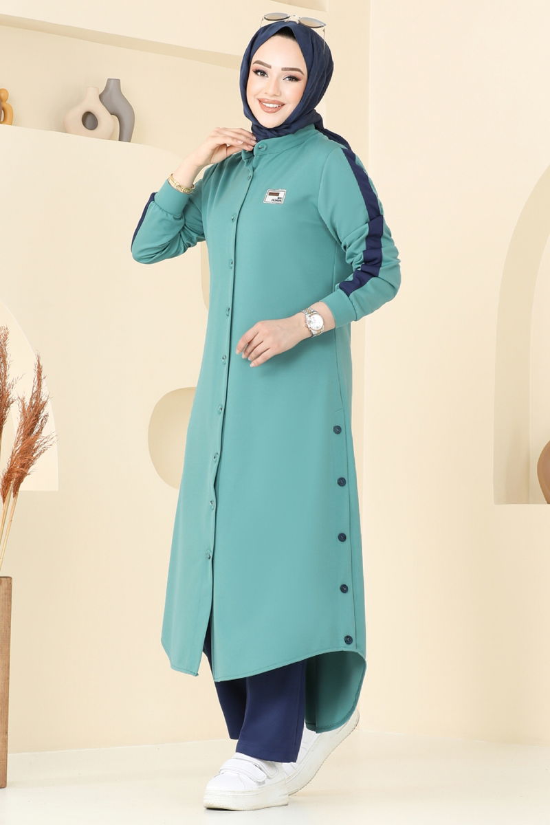 Product Feature : It is a new season hijab fashion product. The product has a Half Judge collar. The product has From the front buttons. Slach buttons are an accessory.. Unlined. The coat of arms detail is sewn. The waist of the trousers is elastic. There may be a tonal difference in the product due to concept photo shoots.