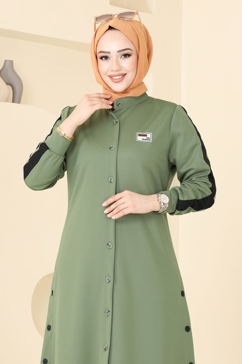 Product Feature : It is a new season hijab fashion product. The product has a Half Judge collar. The product has From the front buttons. Slach buttons are an accessory.. Unlined. The coat of arms detail is sewn. The waist of the trousers is elastic. There may be a tonal difference in the product due to concept photo shoots.