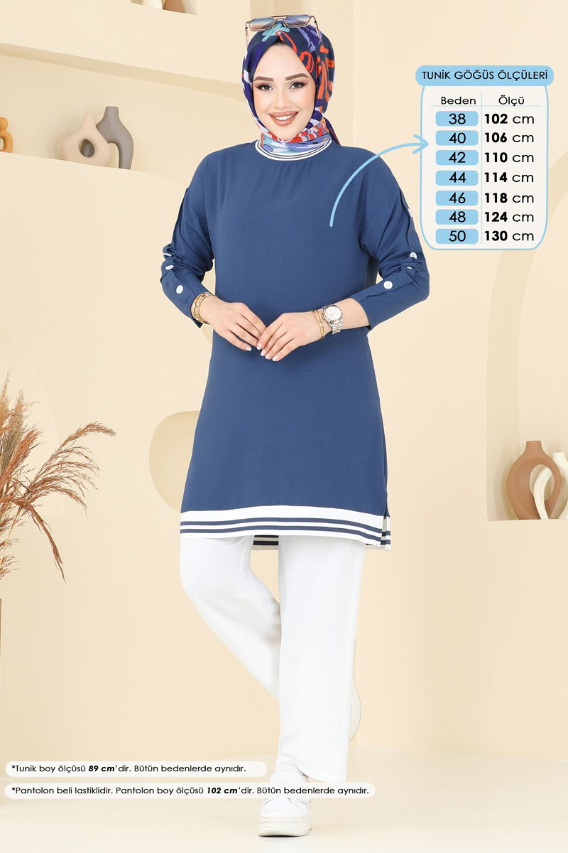 Our Accessorized Suit Combination model is specially designed for ladies who prefer modest apparel. Made from Aerobin fabric, this product can be used comfortably across all seasons. The tunic features a bike neck and chic side slits that provide a modern look, while the elastic waistband of the pants offers maximum comfort. The buttons function merely as accessories, and this piece can be washed at 30 degrees on a gentle cycle. The product shown on the model is size 38.