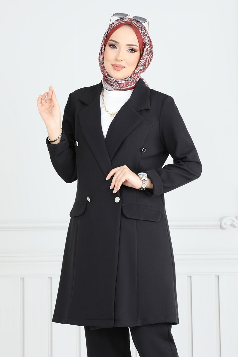The Kruvaze Collar Jacket Set is an elegant option suitable for modest fashion. This ensemble, which can be comfortably worn in all seasons, offers gentle wash at 30 degrees. Made from Dabıl fabric, this product features a crossed collar design and a button-front for practical usage. The unlined jacket enhances comfort, while the elastic-waisted pants take convenience to the next level. Pocket details on both the jacket and pants complete the chic appearance.