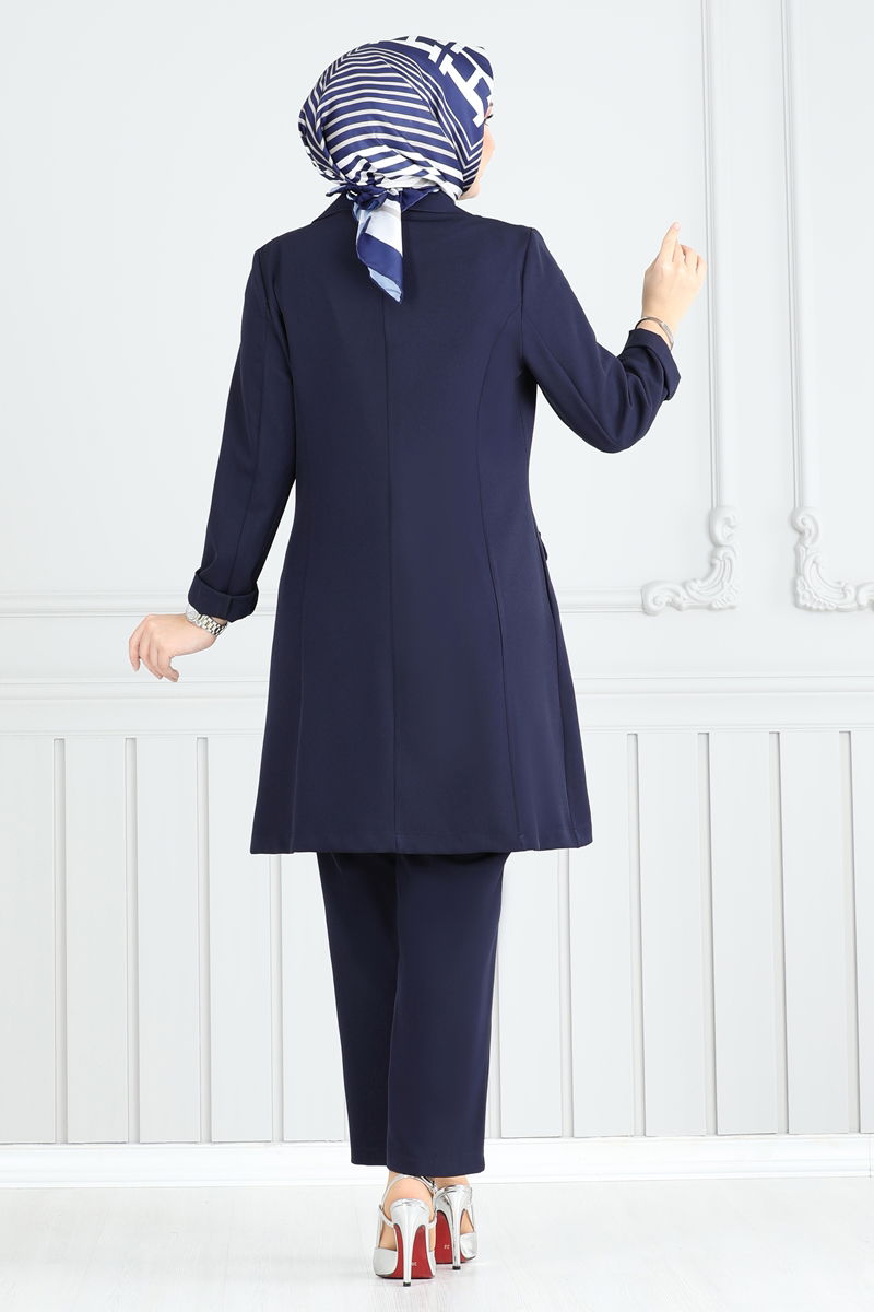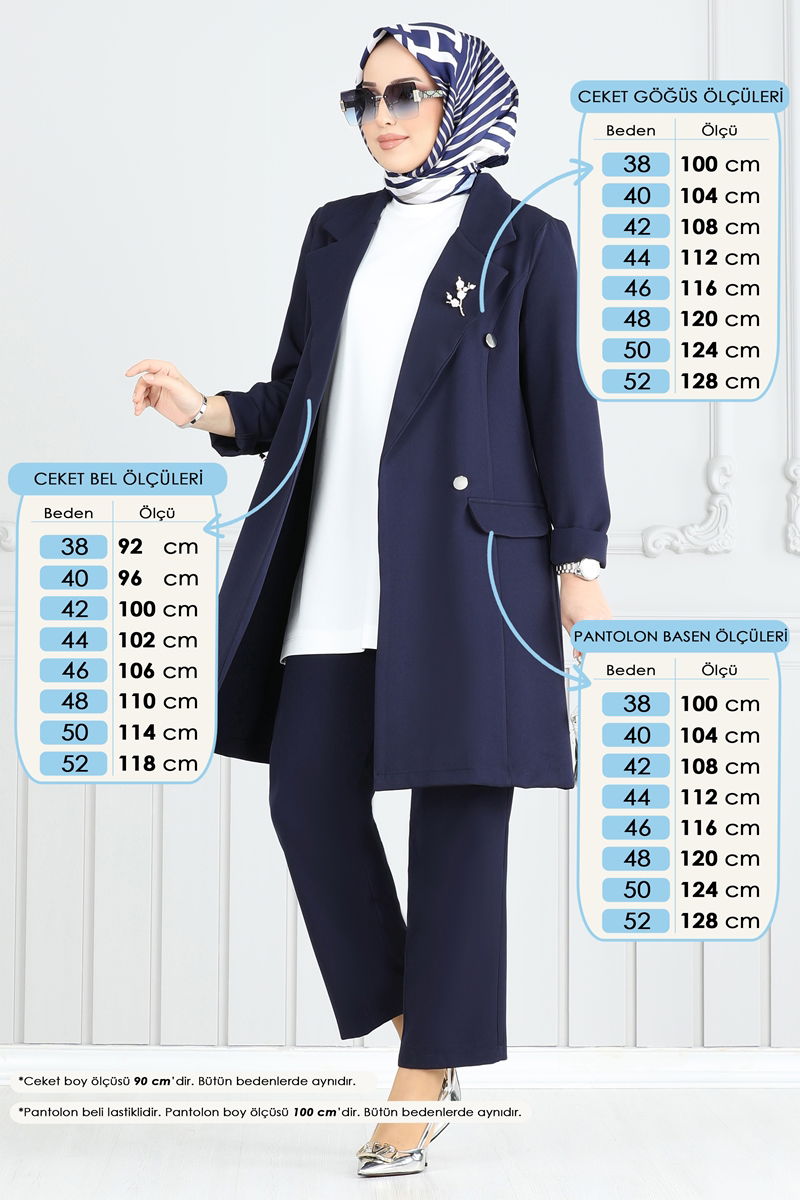 The Kruvaze Collar Jacket Set is an elegant option suitable for modest fashion. This ensemble, which can be comfortably worn in all seasons, offers gentle wash at 30 degrees. Made from Dabıl fabric, this product features a crossed collar design and a button-front for practical usage. The unlined jacket enhances comfort, while the elastic-waisted pants take convenience to the next level. Pocket details on both the jacket and pants complete the chic appearance.