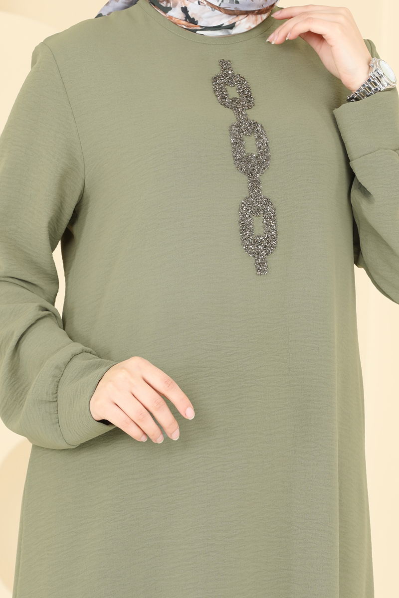 يوجد زر يمكن استخدامه من الخلف. المنتج لديه ياقة دائرية. البلوز تحتوي على فتحة. غير مبطنة. يتم لصق الحجارة. خصر البنطال مرن. قد يكون هناك اختلاف في الدرجة اللونية في المنتج بسبب التقاط الصور الفوتوغرافية.