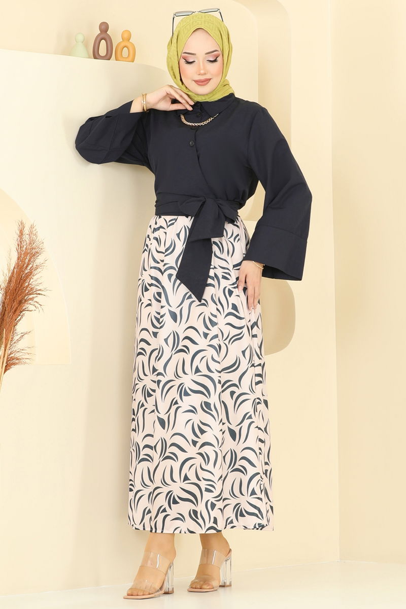 Product Feature : It is a new season hijab fashion product. It has a belt that can be fastened from the side. The product has a Shirt collar. The product has From the front buttons. Unlined. Belt is sewn to the product. Accessories are not included. The skirt waist is elastic. There may be a tonal difference in the product due to concept photo shoots.