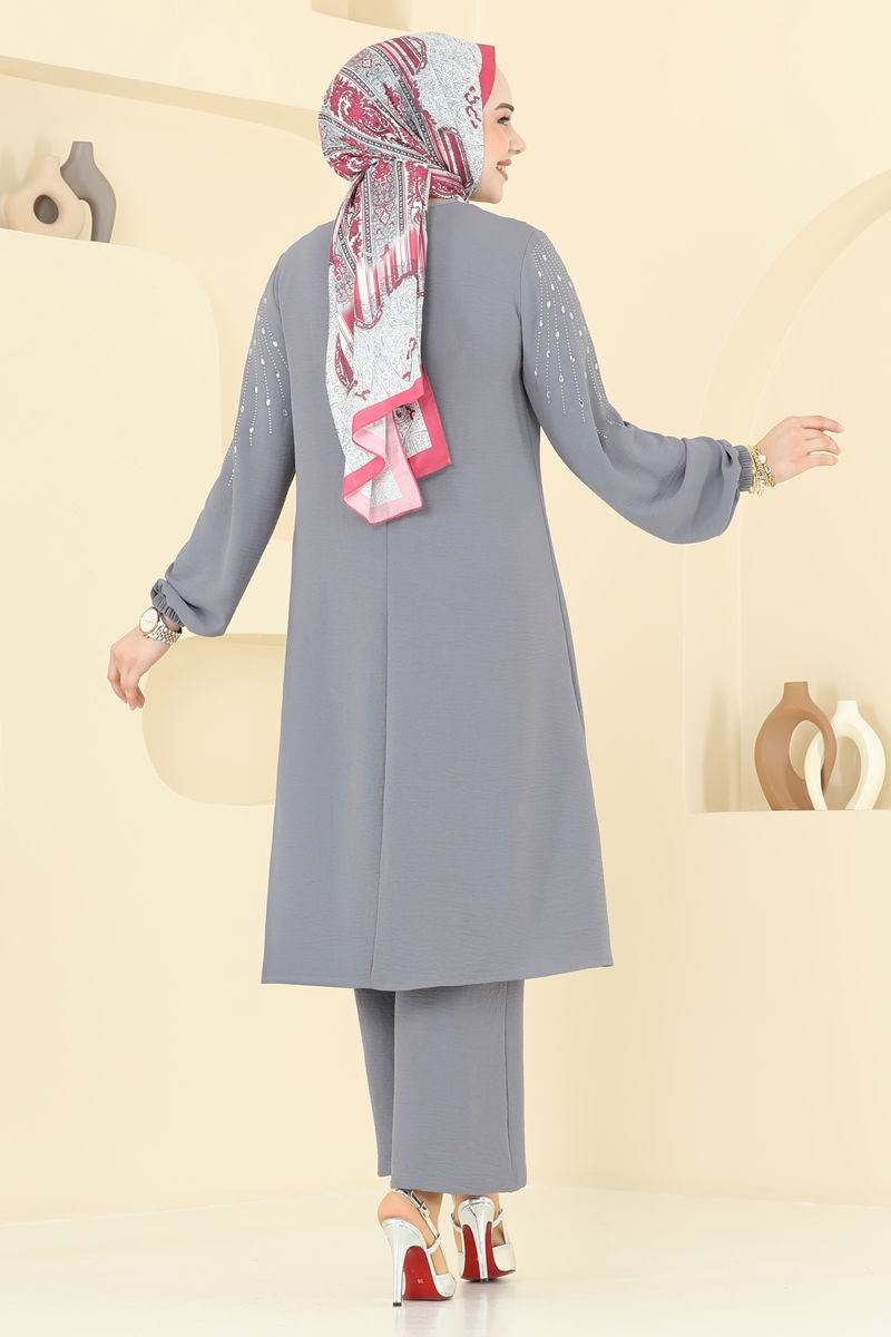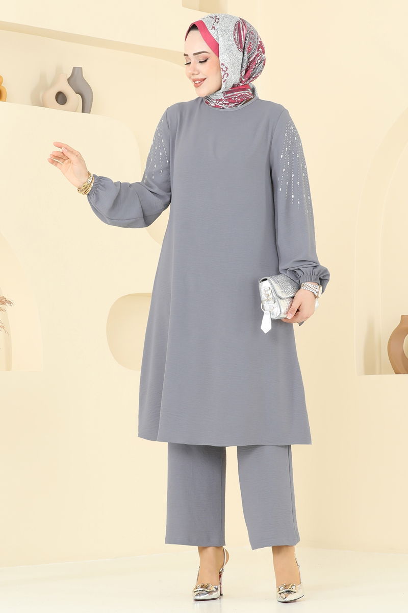 يوجد زر يمكن استخدامه من الخلف. يتم ارتداء المنتج على الرأس. المنتج لديه ياقة دائرية. غير مبطنة. يتم لصق الحجارة. خصر البنطال مرن. السوار مطاطي. قد يكون هناك اختلاف في الدرجة اللونية في المنتج بسبب التقاط الصور الفوتوغرافية.
