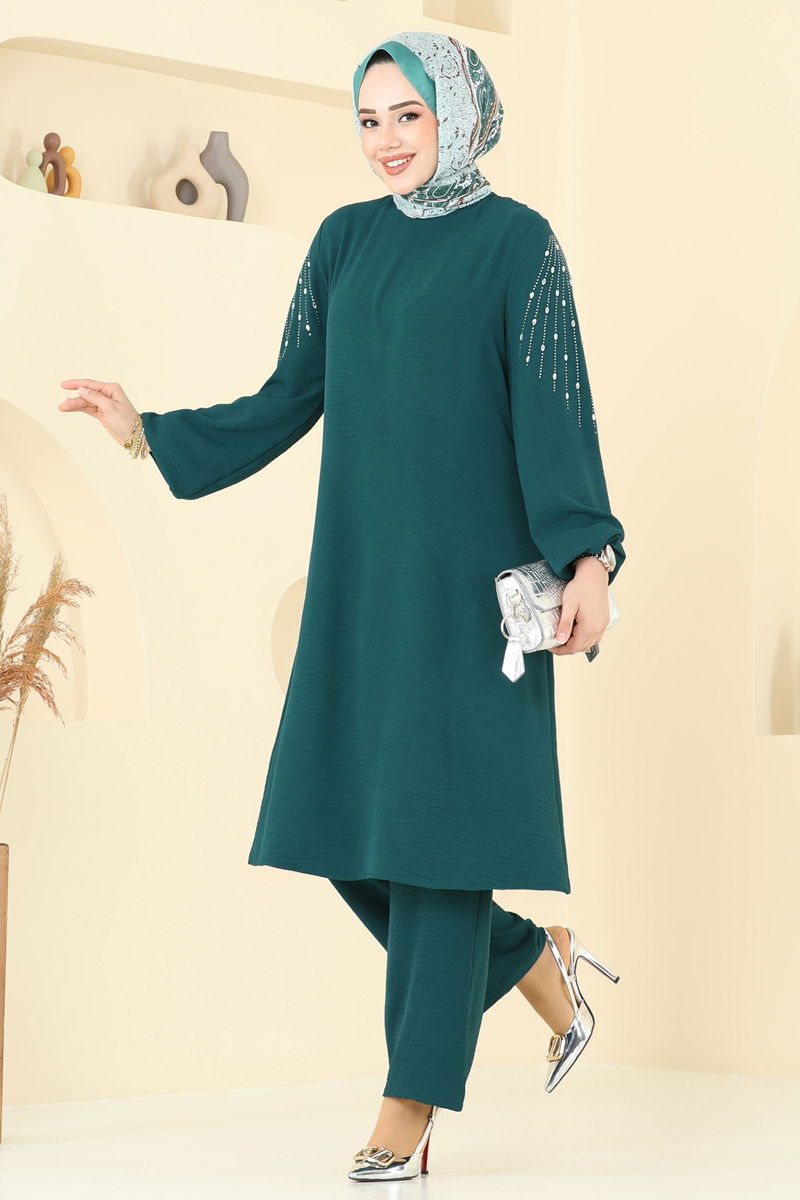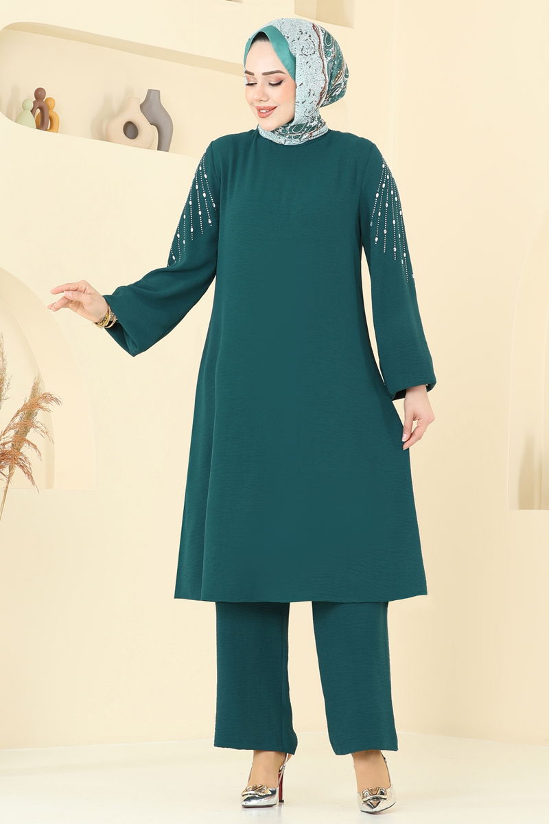 يوجد زر يمكن استخدامه من الخلف. يتم ارتداء المنتج على الرأس. المنتج لديه ياقة دائرية. غير مبطنة. يتم لصق الحجارة. خصر البنطال مرن. السوار مطاطي. قد يكون هناك اختلاف في الدرجة اللونية في المنتج بسبب التقاط الصور الفوتوغرافية.