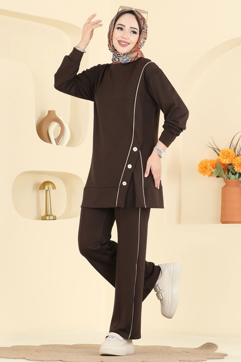 المنتج لديه ياقة دائرية. المنتج به أزرار من الأمام. البلوز تحتوي على فتحة. غير مبطن .الداخل غير شفاف. تتم خياطة تفاصيل الملحقات على المنتج. الأزرار هي إكسسوارات. خصر البنطال مرن. قد يكون هناك اختلاف في الدرجة اللونية في المنتج بسبب التقاط الصور الفوتوغرافية.