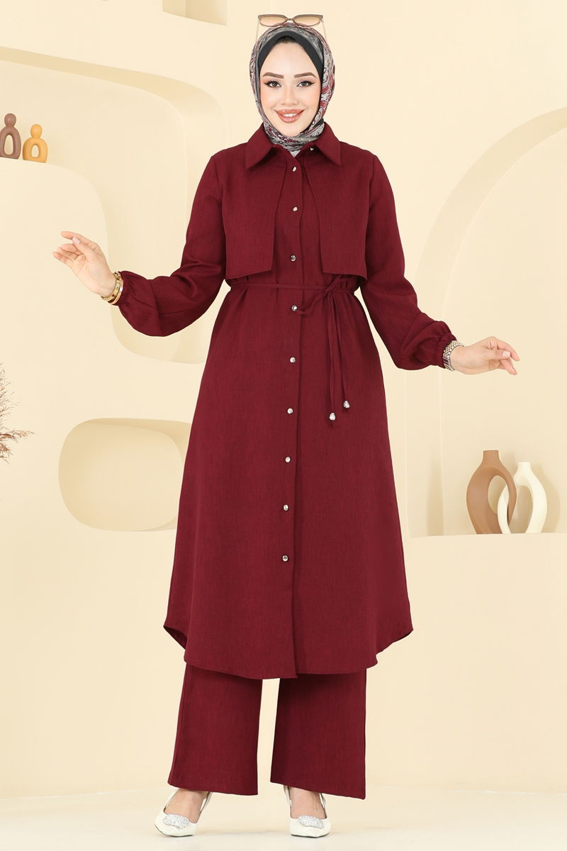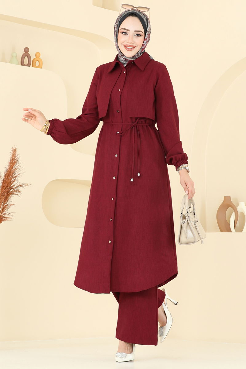 Product Feature : It is a new season hijab fashion product. The product has a Shirt collar. The product has From the front buttons. Unlined. Details are sewn. Belt included, optional not available. Blouse is not included. Sample combination is made with the blouse to show the intended use of the product. The waist of the trousers is elastic. The cuff is rubberized. There may be a tonal difference in the product due to concept photo shoots.