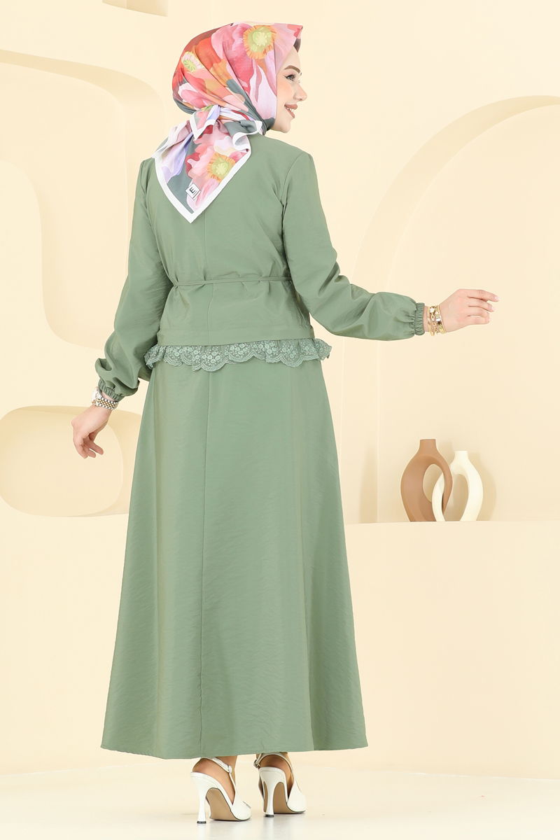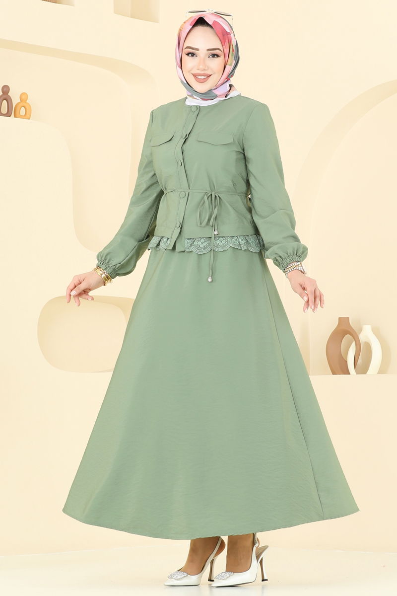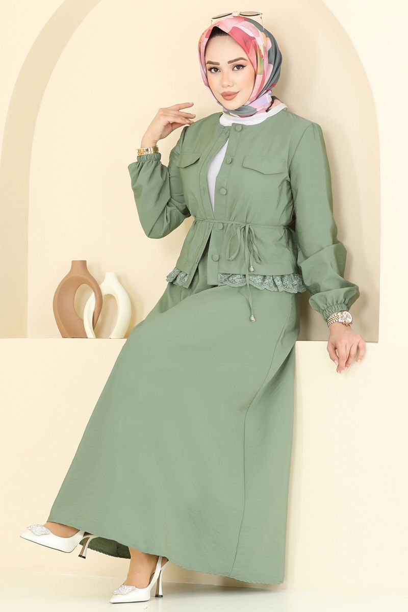 Elegantly designed and highly practical, the Lace Detail Skirt Suit offers a modern and stylish option for modest fashion. Suitable for all seasons, this outfit is made from Cupra fabric and can be delicately washed at 30 degrees. Featuring a bicycle collar and front button details, it offers ease of use, while the unlined structure provides a light and comfortable experience. The lace details and belt design enhance the elegance of the suit, which also features an elastic waistband on the skirt for perfect fit. The blouse includes a pocket detail and elastic cuffs, adding functionality to the ensemble.