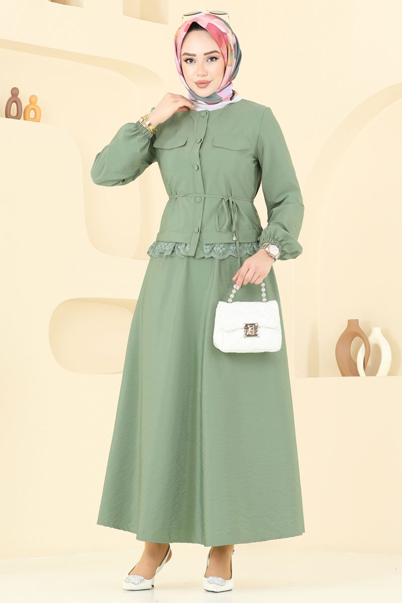 Product Feature : It is a new season hijab fashion product. The product has a Cycling collar. The product has From the front buttons. Unlined. The guipure detail is sewn. Belt included, optional not available. Blouse is not included. Sample combination is made with the blouse to show the intended use of the product. Pocket detail is an accessory. The skirt waist is elastic. The cuff is rubberized. There may be a tonal difference in the product due to concept photo shoots.