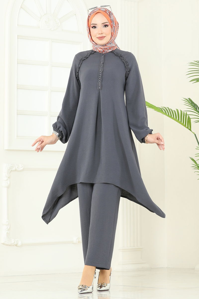 Asymmetric Cut Set is specially designed for modest fashion, offering all-season wearability. It can be washed gently at 30 degrees and is made from aerobin fabric. This set features a crew neck and a lining-free design that provides a contemporary look. The elastic cuffs on the tunic and pants enhance comfort, while the button detail at the back adds stylish finishing touches. The elastic waistband on the pants ensures comfort throughout the day.