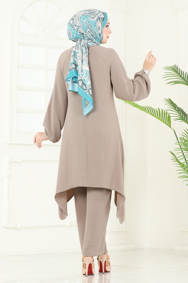 Asymmetric Cut Set is specially designed for modest fashion, offering all-season wearability. It can be washed gently at 30 degrees and is made from aerobin fabric. This set features a crew neck and a lining-free design that provides a contemporary look. The elastic cuffs on the tunic and pants enhance comfort, while the button detail at the back adds stylish finishing touches. The elastic waistband on the pants ensures comfort throughout the day.
