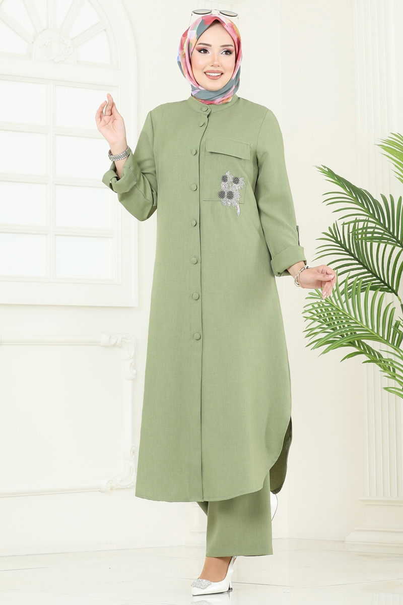 المنتج لديه ياقة نصف بيضوية. المنتج به أزرار من الأمام. البلوز تحتوي على فتحة. غير مبطنة. تفاصيل الخرز مخيطة. الجيب الصدري نشط. خصر البنطال مرن. أزرار الكفة نشطة. قد يكون هناك اختلاف في الدرجة اللونية في المنتج بسبب التقاط الصور الفوتوغرافية.