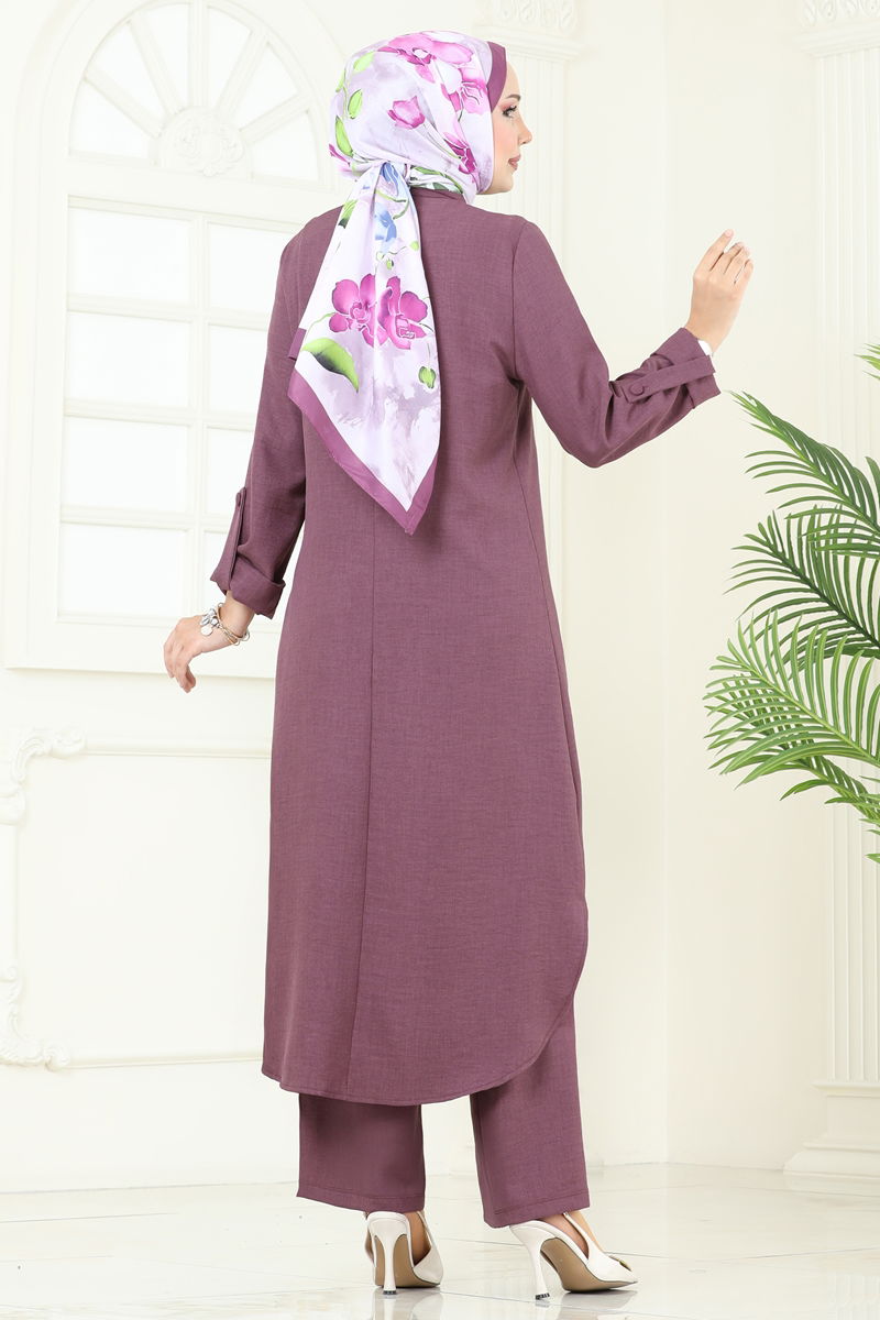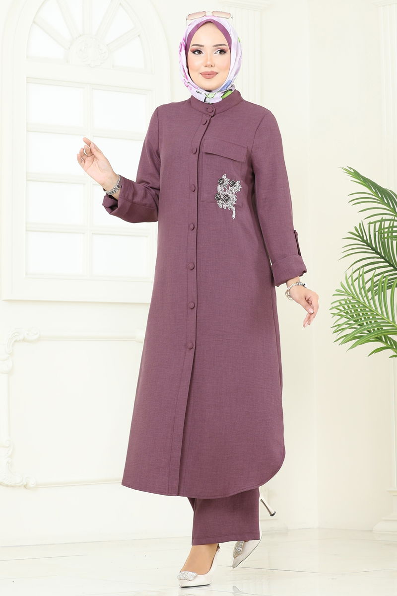 Product Feature : It is a new season hijab fashion product. The product has a Half Judge collar. The product has From the front buttons. The tunic has a side slash.. Unlined. Bead details are sewn. The chest pocket is active. The waist of the trousers is elastic. Cuff buttons are active. There may be a tonal difference in the product due to concept photo shoots.