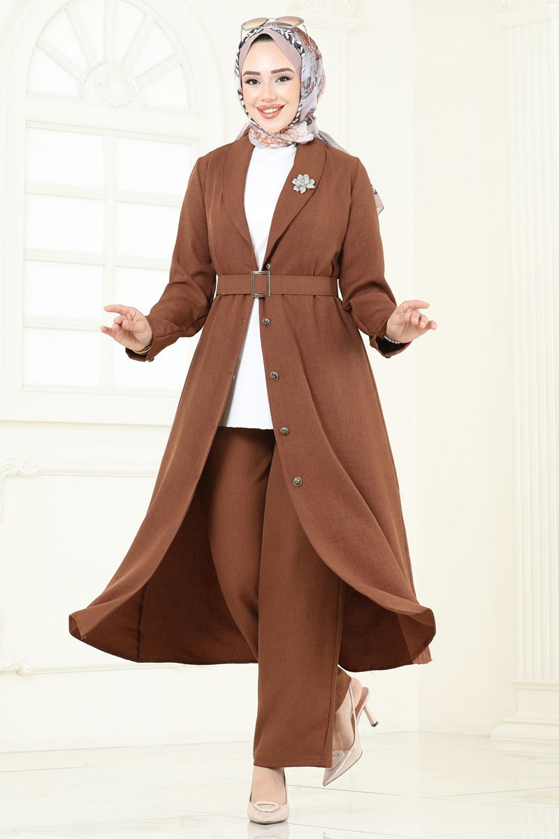 المنتج لديه ياقة مفتوحة. المنتج به أزرار من الأمام. غير مبطنة. الحزام متضمن، ،يمكن استخدامها حسب الرغبة خصر البنطال مرن. قد يكون هناك اختلاف في الدرجة اللونية في المنتج بسبب التقاط الصور الفوتوغرافية.