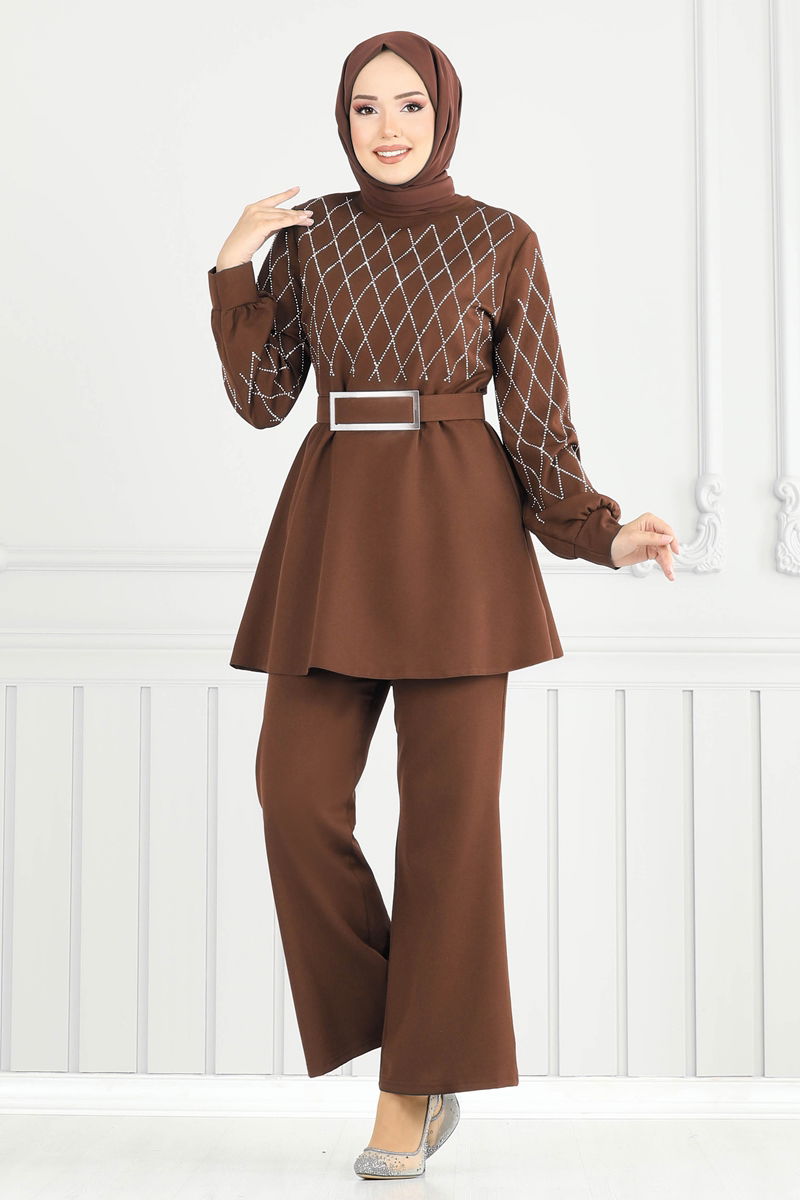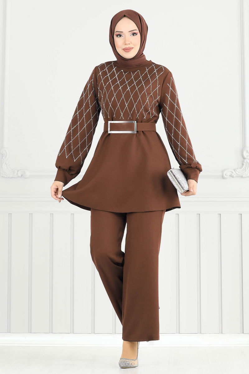 المنتج لديه ياقة دائرية. غير مبطنة. المنتج به سحاب في جزء من الخلف. يتم لصق الحجارة. المنتج يحتوي على حزام خصر مُخاط. الحزام متضمن، ،يمكن استخدامها حسب الرغبة خصر البنطال مرن. قد يكون هناك اختلاف في الدرجة اللونية في المنتج بسبب التقاط الصور الفوتوغرافية.