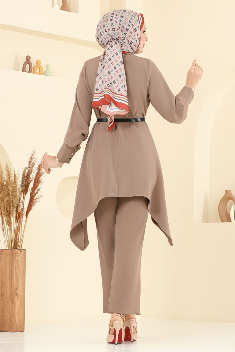 Product Feature : It is a new season hijab fashion product. The product has a Cycling collar. The product has from the back buttons. Unlined. Belt included, optional not available. The waist of the trousers is elastic. There may be a tonal difference in the product due to concept photo shoots.