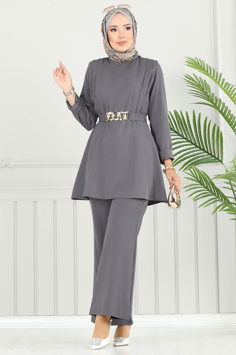 المنتج لديه ياقة دائرية. غير مبطنة. المنتج به سحاب في جزء من الخلف. المنتج يحتوي على حزام خصر مُخاط. الحزام متضمن، ،يمكن استخدامها حسب الرغبة خصر البنطال مرن. قد يكون هناك اختلاف في الدرجة اللونية في المنتج بسبب التقاط الصور الفوتوغرافية.