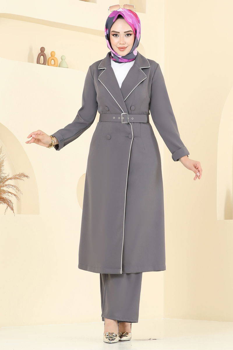 يوجد زر متاح من الأمام. المنتج لديه ياقة مفتوحة. غير مبطنة. الأزرار هي إكسسوارات. الحزام متضمن، ،يمكن استخدامها حسب الرغبة خصر البنطال مرن. قد يكون هناك اختلاف في الدرجة اللونية في المنتج بسبب التقاط الصور الفوتوغرافية.