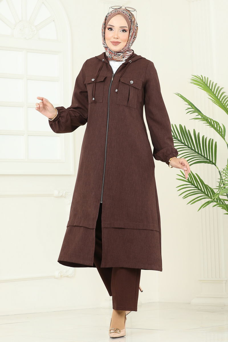 Product Feature : It is a new season hijab fashion product. The product has a Hooded collar. Unlined. The product has a zipper at the From the front part. The product has a pocket. The waist of the trousers is elastic. The cuff is rubberized. There may be a tonal difference in the product due to concept photo shoots.