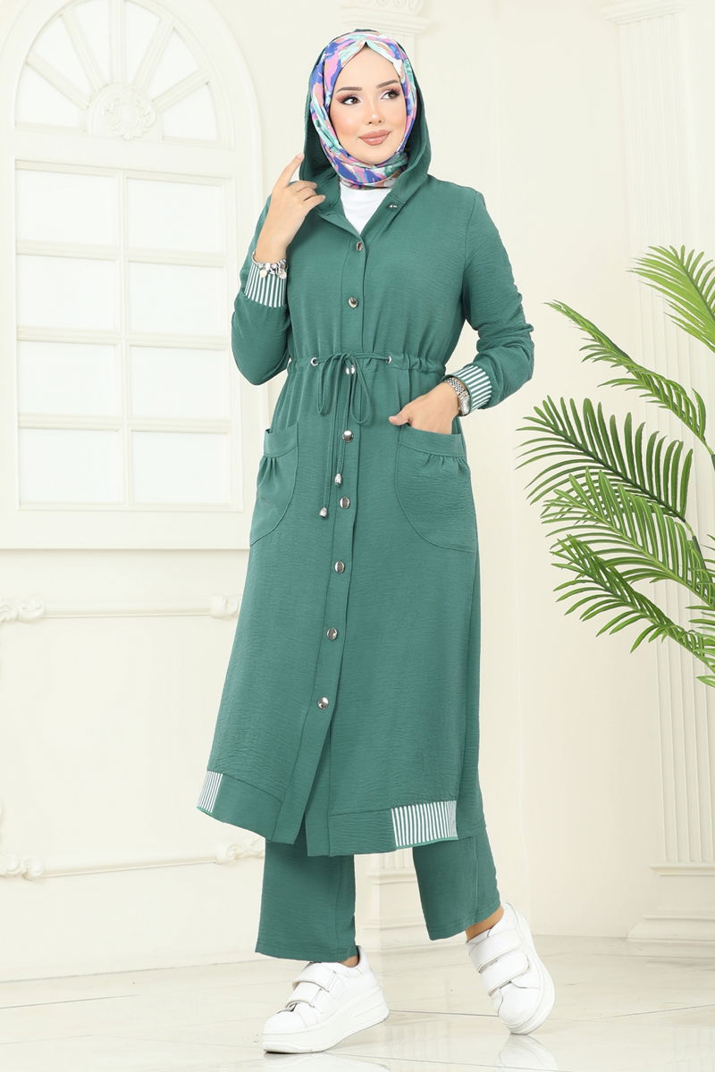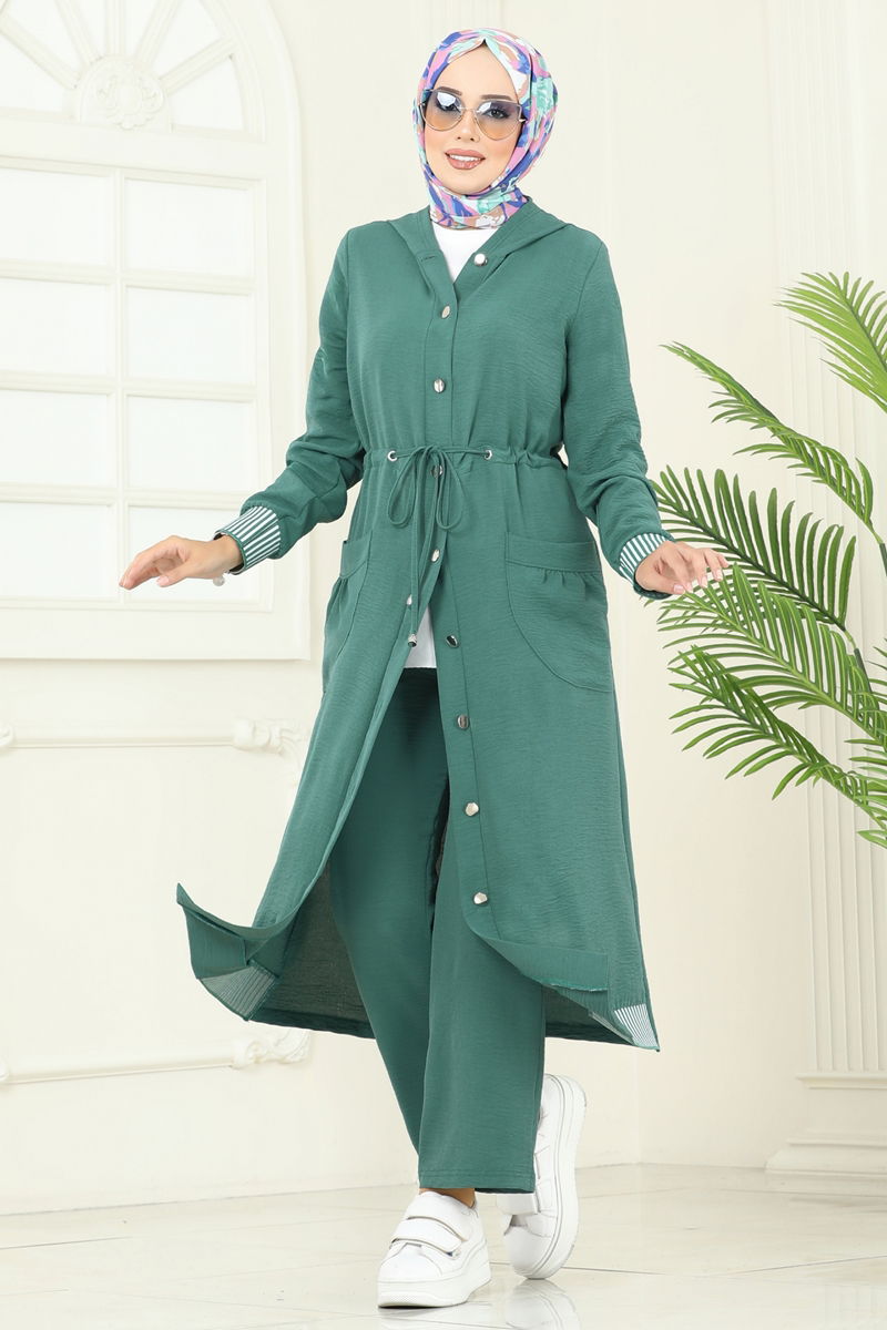 يتميز بخصر ذو أربطة. المنتج لديه ياقة مع قبعة. المنتج به أزرار من الأمام. غير مبطنة. الجيب متاح. خصر البنطال مرن. قد يكون هناك اختلاف في الدرجة اللونية في المنتج بسبب التقاط الصور الفوتوغرافية.