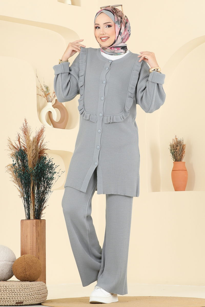 Embrace the season's essential with the Ruffle Detailed Knit Suit , offering elegance and comfort in modest wear. This suit ensures you stay warm during autumn and winter and offers durability with its gentle wash feature. Its bicycle neckline and button-front design provide both style and practicality, while the elastic waistband on the pants enhances your comfort. Suitable for standard sizes, this set will elevate your style.