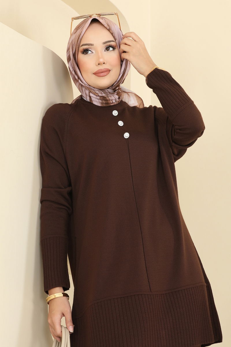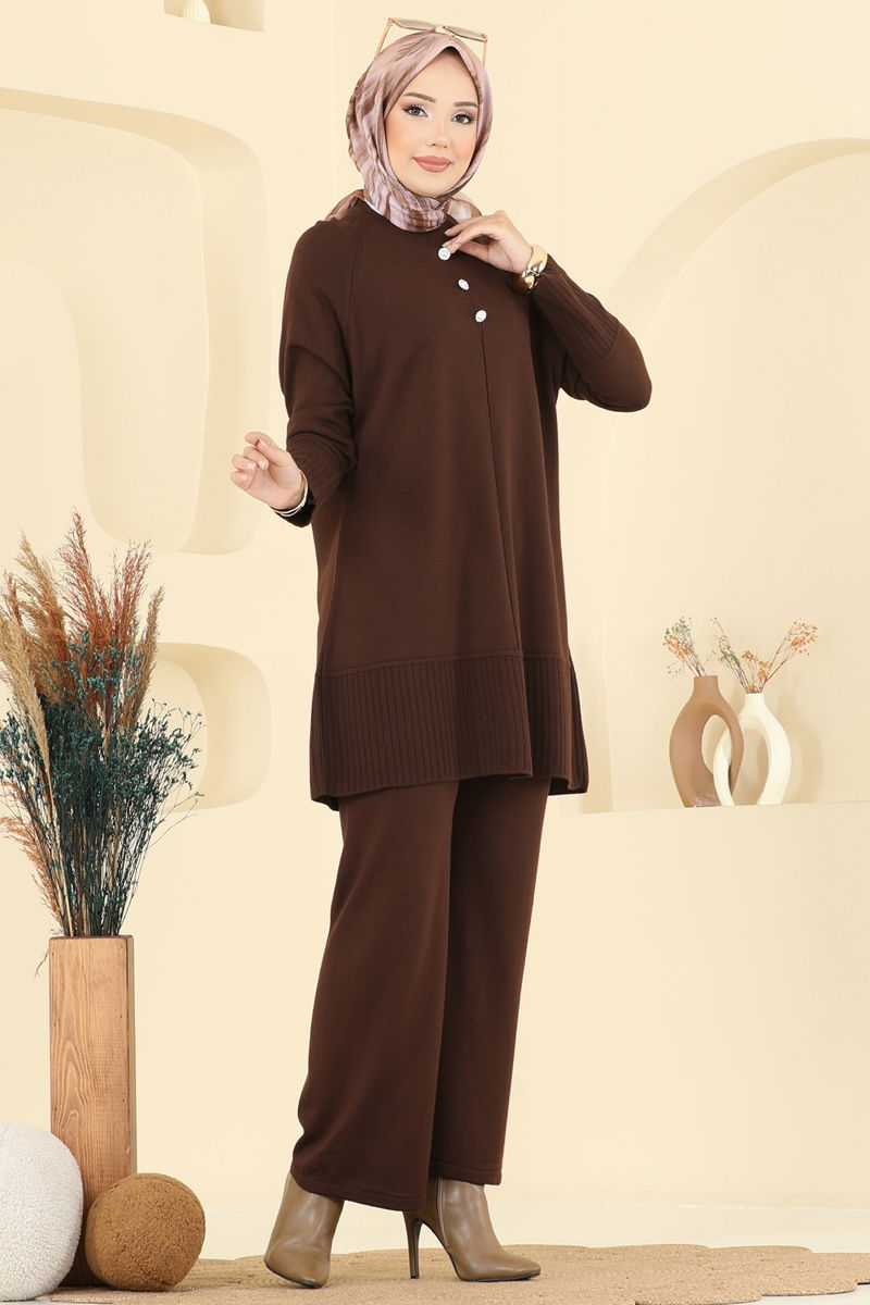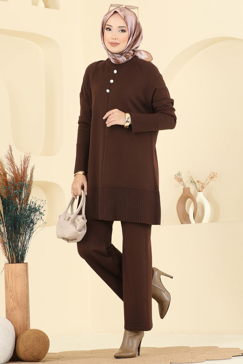 Smart and stylish, the Buttoned Knitwear Set with Accessories is designed to warm your autumn and winter. Offering ease of washing at 30 degrees with a delicate wash feature, this hijab-friendly product combines comfort and elegance. Made from knit fabric, the set consists of a bicycle neck tunic and an elastic waist pants. Complete your style with buttons added as accessories.