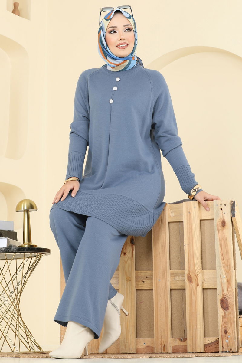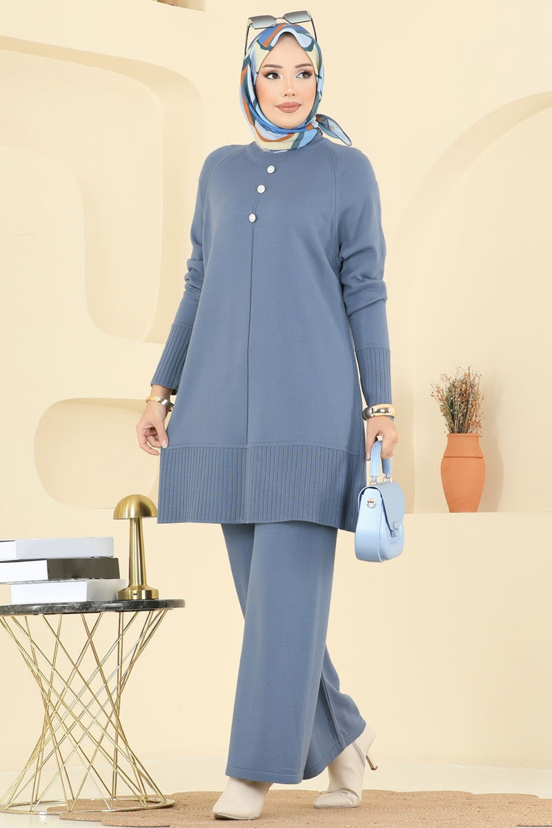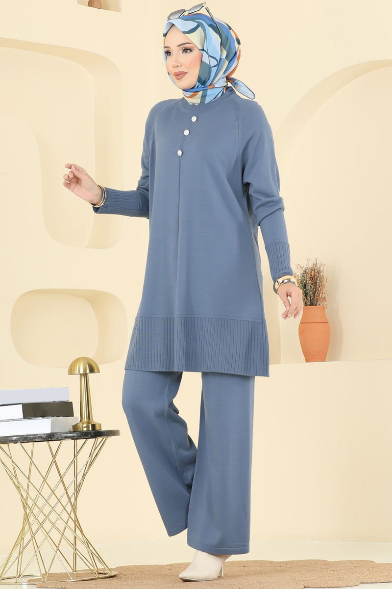 Smart and stylish, the Buttoned Knitwear Set with Accessories is designed to warm your autumn and winter. Offering ease of washing at 30 degrees with a delicate wash feature, this hijab-friendly product combines comfort and elegance. Made from knit fabric, the set consists of a bicycle neck tunic and an elastic waist pants. Complete your style with buttons added as accessories.