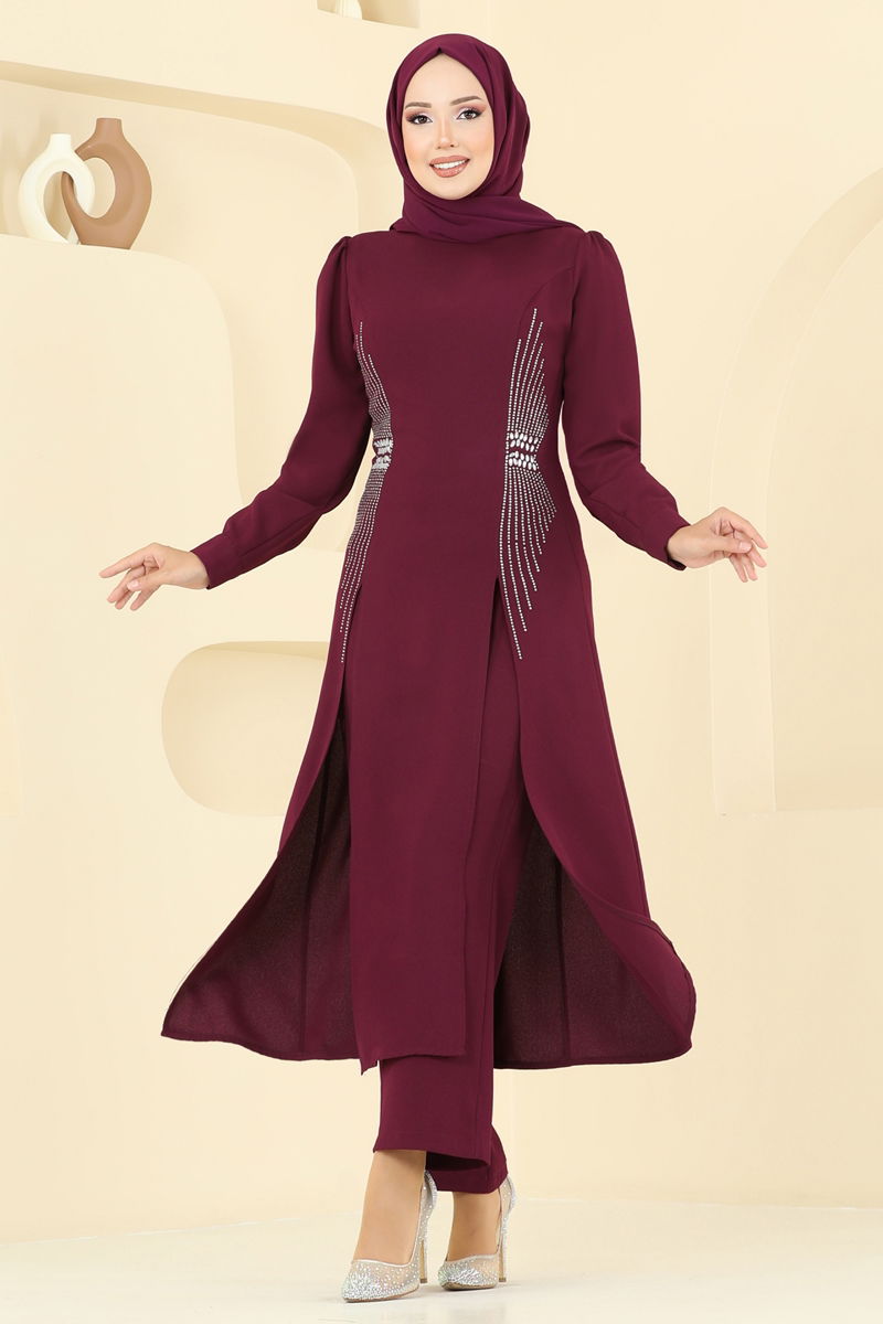 المنتج لديه ياقة نصف بيضوية. يحتوي على فتحة. غير مبطنة. المنتج به سحاب في جزء من الخلف. يتم لصق الحجارة. خصر البنطال مرن. أزرار الكفة نشطة. قد يكون هناك اختلاف في الدرجة اللونية في المنتج بسبب التقاط الصور الفوتوغرافية.