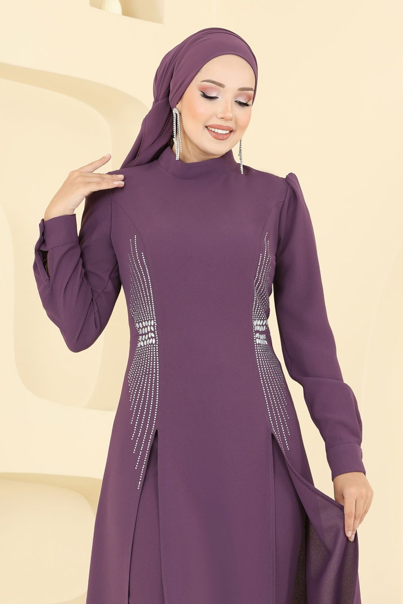 Product Feature : It is a new season hijab fashion product. The product has a Half Judge collar. It has a slash.. Unlined. The product has a zipper at the from the back part. The stones are glued. The waist of the trousers is elastic. Cuff buttons are active. There may be a tonal difference in the product due to concept photo shoots.