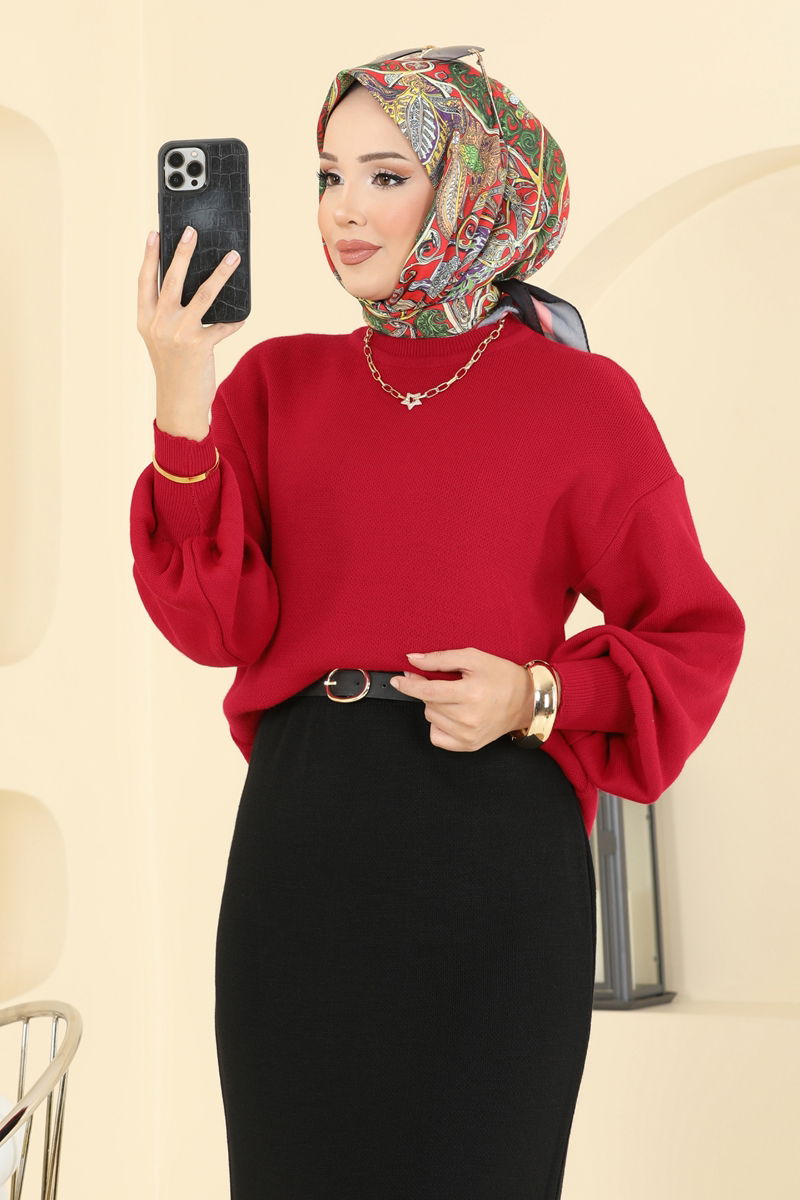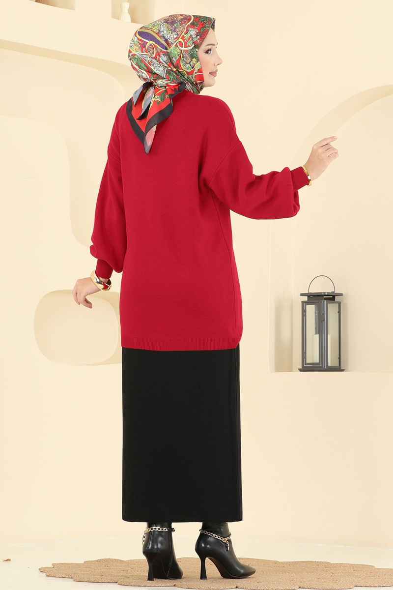 Our Skirted Knitwear Set KOMBIN model is a special product suitable for your conservative clothing style, which can be comfortably used during autumn and winter seasons. It is made from high-quality knit fabric, ensuring a long life span. It can be washed at 30 degrees with delicate care. The model features a bicycle neck design and is without lining. The skirt has an elastic waist design, offering a comfortable fit. The product is displayed on the model in a standard size.