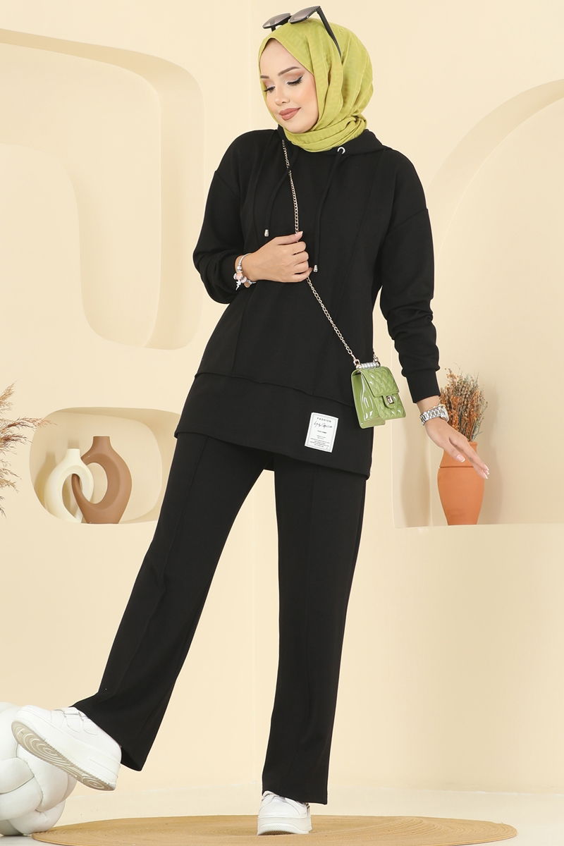 The Hooded Detail Modal Suit COMBINE is a modest wear suitable for all seasons. Made from modal fabric, it features a hooded neckline and is unlined. The model displayed wears a size 38. It requires gentle washing at up to 30 degrees Celsius. The trousers have an elastic waist, ensuring comfort in both the tunic and trousers.
