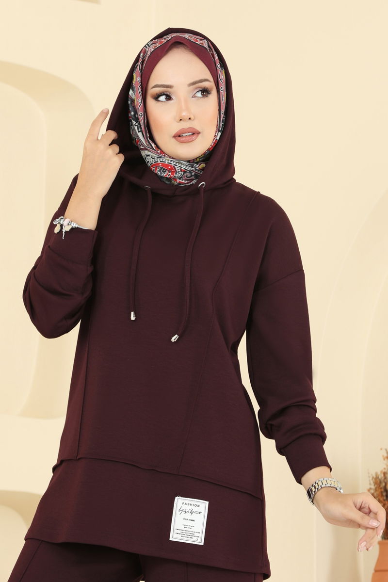 The Hooded Detail Modal Suit COMBINE is a modest wear suitable for all seasons. Made from modal fabric, it features a hooded neckline and is unlined. The model displayed wears a size 38. It requires gentle washing at up to 30 degrees Celsius. The trousers have an elastic waist, ensuring comfort in both the tunic and trousers.
