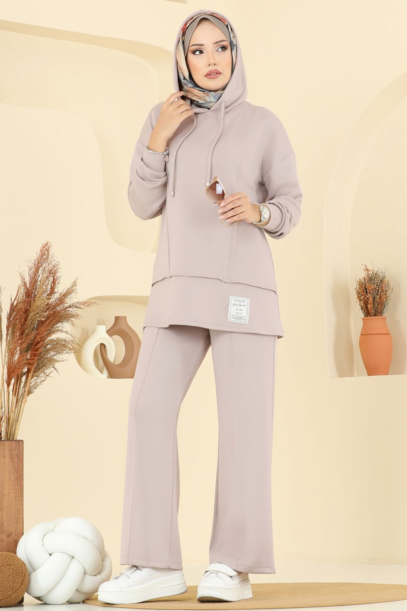 The Hooded Detail Modal Suit COMBINE is a modest wear suitable for all seasons. Made from modal fabric, it features a hooded neckline and is unlined. The model displayed wears a size 38. It requires gentle washing at up to 30 degrees Celsius. The trousers have an elastic waist, ensuring comfort in both the tunic and trousers.