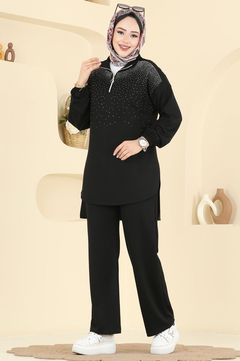 يوجد سحاب نصفي يمكن استخدامه من الأمام. المنتج لديه ياقة مستقيم. غير مبطنة. يتم لصق الحجارة. خصر البنطال مرن. السوار مطاطي. قد يكون هناك اختلاف في الدرجة اللونية في المنتج بسبب التقاط الصور الفوتوغرافية.