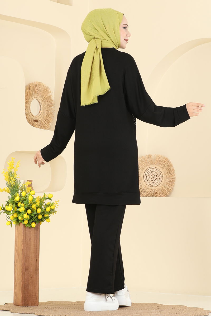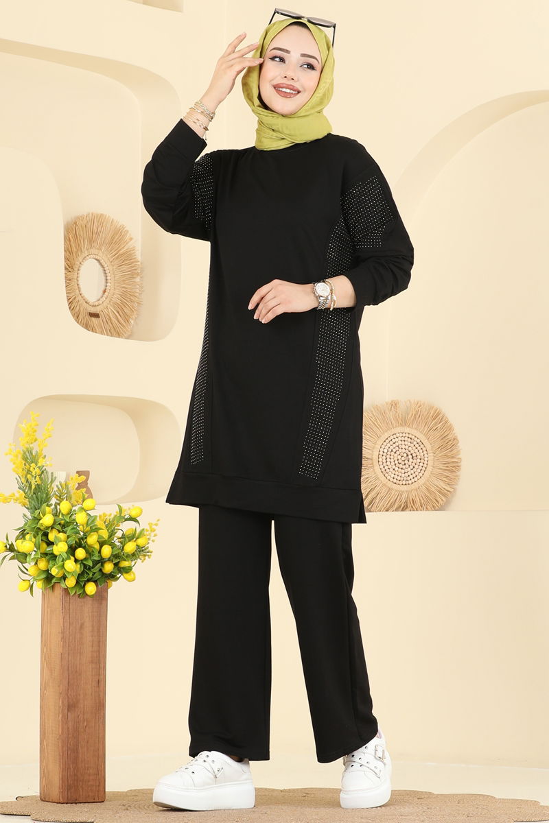 المنتج لديه ياقة دائرية. غير مبطنة. يتم لصق الحجارة. خصر البنطال مرن. قد يكون هناك اختلاف في الدرجة اللونية في المنتج بسبب التقاط الصور الفوتوغرافية.