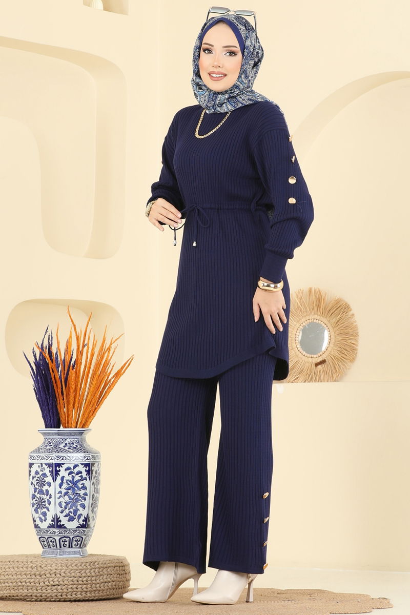 The Drawstring Waist Knit Suit, with its KOMBIN model, introduces a new style in modest fashion. Ideal for autumn and winter, this product offers ease of use with its gentle wash at 30 degrees option. The knit fabric keeps you warm while the crew neck marries elegance with comfort. The drawstring waist design and elastic pant waist provide a perfect fit. Offered as a set with a tunic and pants, this product caters to a broad audience with sizes ranging from 36-38-40-42.