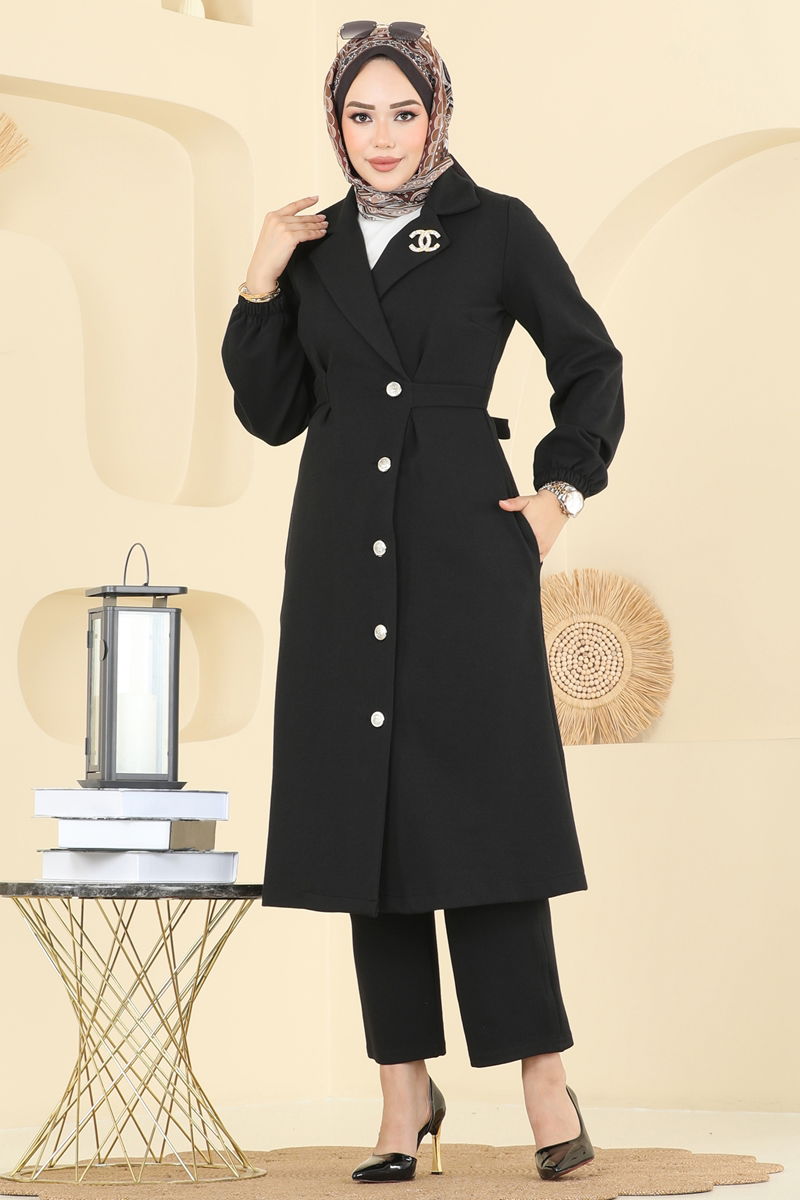Product Feature : It is a new season hijab fashion product. There is a hidden pocket in the product. The product has a Double-breasted collar. The product has From the front buttons. Unlined. Belt is sewn to the product. The waist of the trousers is elastic. The cuff is rubberized. There may be a tonal difference in the product due to concept photo shoots.