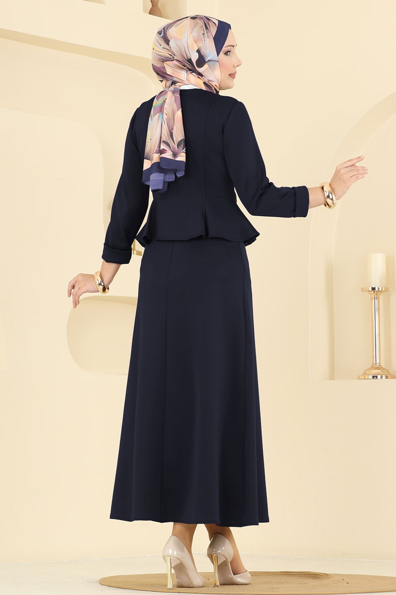 The Gold Snap Button Elegant Suit is a modest wear product that combines elegance and comfort. Suitable for all seasons, this suit can be washed carefully at 30 degrees. Made from scuba diver fabric, this outfit features a mandarin collar design and active snap details. The skirt is zippered and the suit is unlined. With its chic and modern design, the Gold Snap Button Elegant Suit will become an indispensable part of your wardrobe.