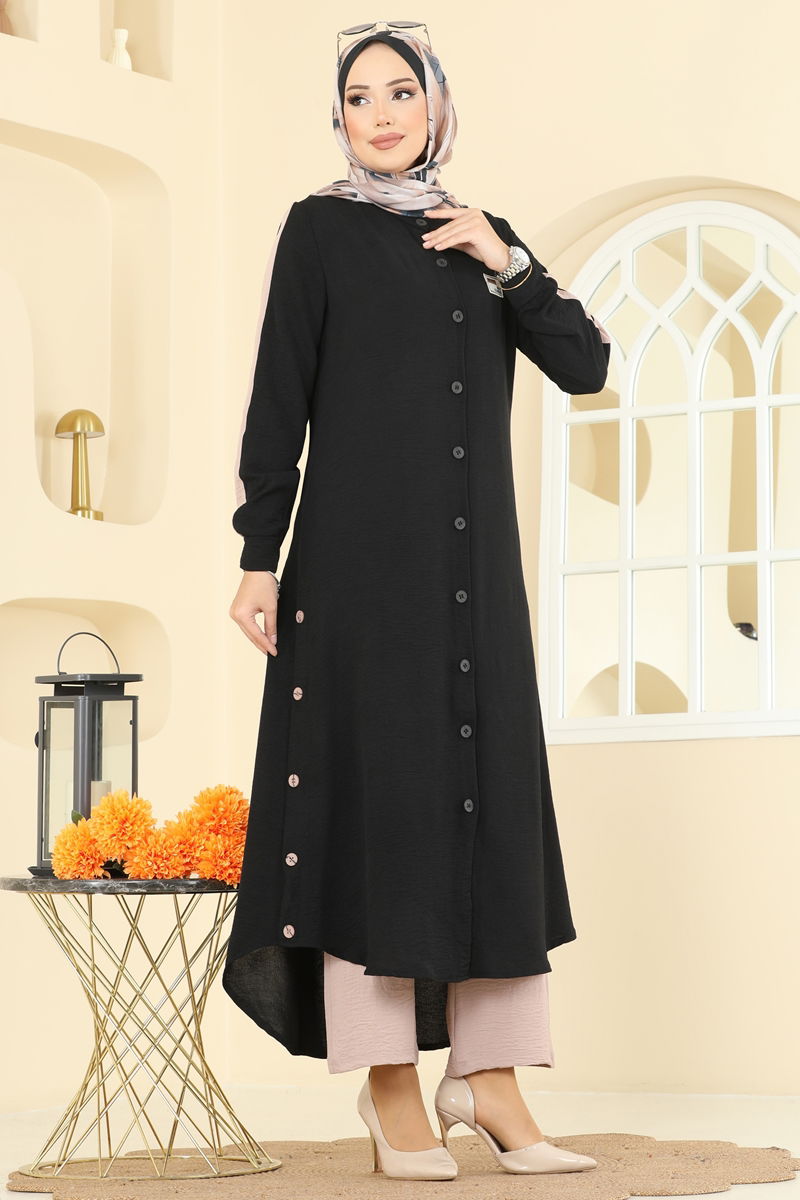 The Button Detailed Aerobin Set is an elegant and stylish choice for a modest outfit that can be worn in any season. The soft texture and breathable structure of the aerobin fabric provides comfort throughout the day. The half mandarin collar and button details on the front offer a modern look, while the elastic waistband of the pants ensures a perfect fit, allowing freedom of movement. Consisting of a tunic and pants, this set is ideal for both everyday and special occasions. The product can be washed delicately at 30 degrees and is easy to maintain.
