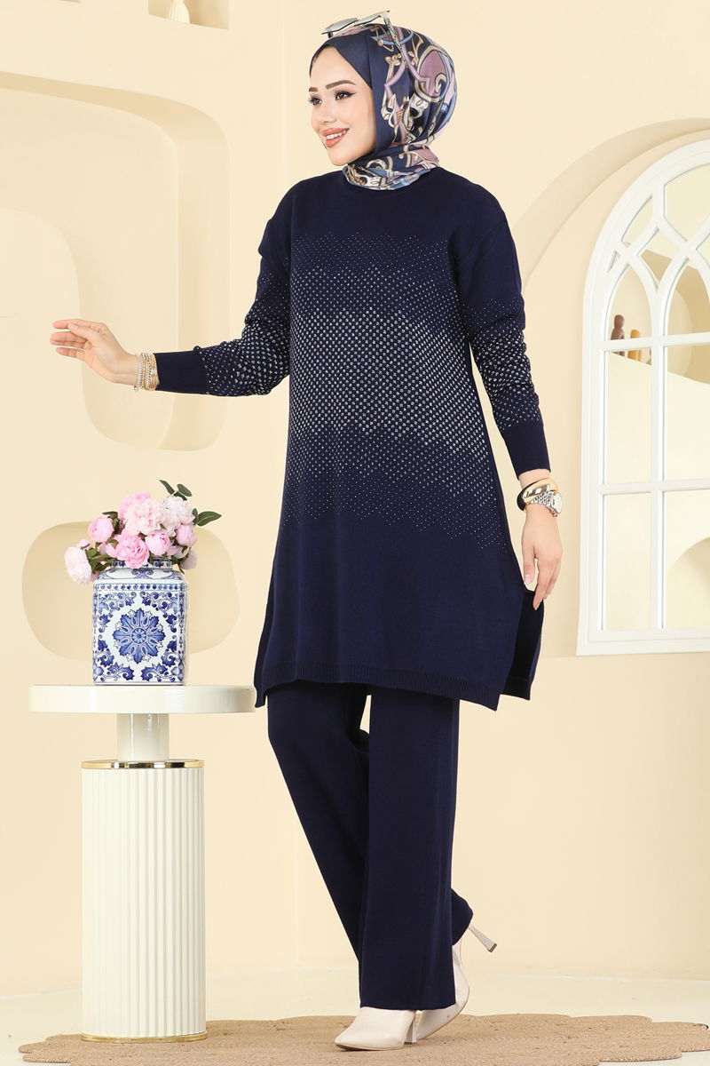 يتم ارتداء المنتج على الرأس. المنتج لديه ياقة دائرية. البلوز تحتوي على فتحة. غير مبطنة. يتم لصق الحجارة. خصر البنطال مرن. قد يكون هناك اختلاف في الدرجة اللونية في المنتج بسبب التقاط الصور الفوتوغرافية.