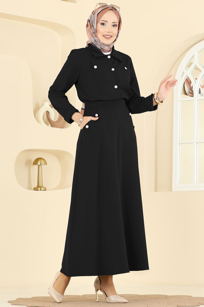 The KOMBİN model, with its Button Detailed Skirt Suit, adds an elegant touch to modest wear, offering comfort and style throughout all seasons. Washable at 30 degrees on a gentle cycle, this suit provides ease of use. Its shirt collar and button-front design offer practical usability, while its unlined structure gives lightness. The skirt features pockets and decorative buttons, merging functionality with aesthetics. The zippered waist ensures a perfect fit, adapting comfortably to any size. Ideal for both everyday use and special occasions, this suit will let your style speak for itself.