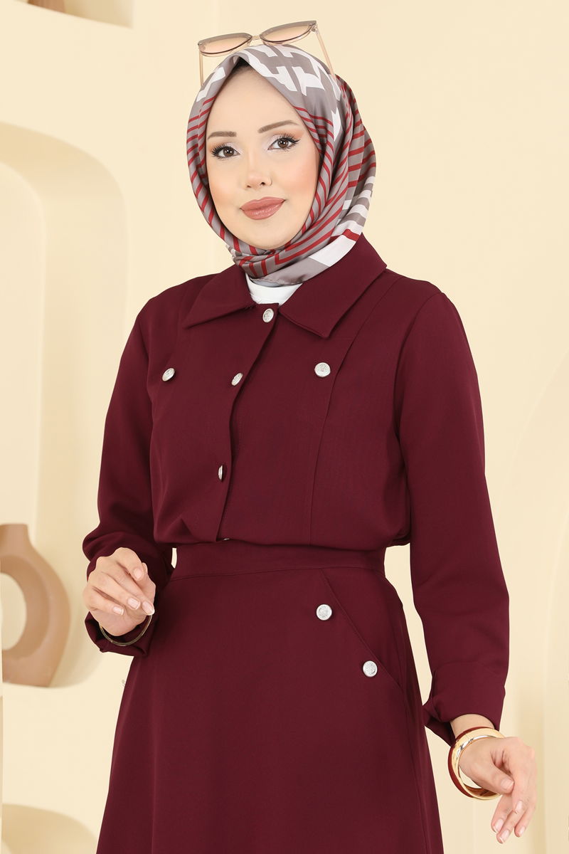 The KOMBİN model, with its Button Detailed Skirt Suit, adds an elegant touch to modest wear, offering comfort and style throughout all seasons. Washable at 30 degrees on a gentle cycle, this suit provides ease of use. Its shirt collar and button-front design offer practical usability, while its unlined structure gives lightness. The skirt features pockets and decorative buttons, merging functionality with aesthetics. The zippered waist ensures a perfect fit, adapting comfortably to any size. Ideal for both everyday use and special occasions, this suit will let your style speak for itself.